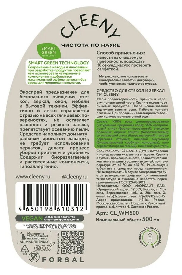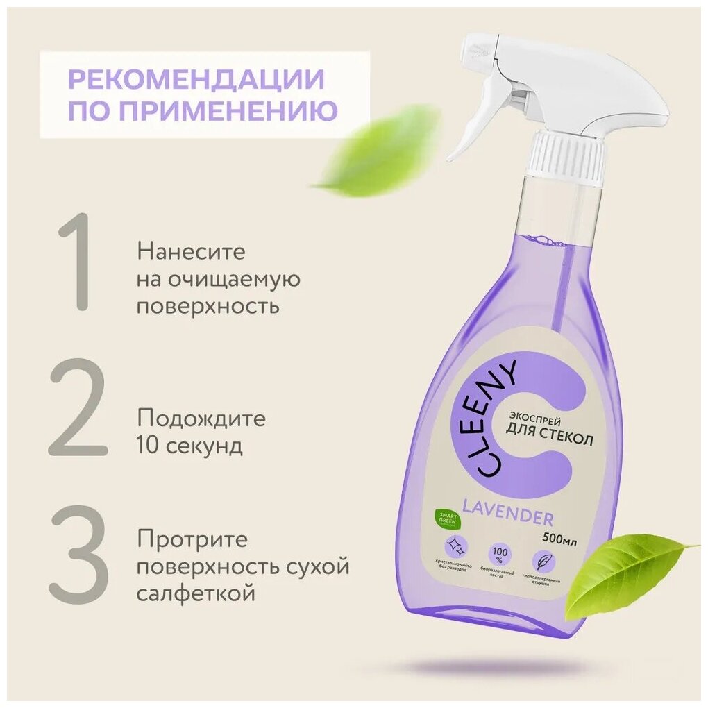 Экоспрей предназначен для безопасного очищения стекол, зеркал, окон, мебели и бытовой техники. Эффективно и легко справляется с грязью на всех глянцевых поверхностях, не оставляет разводов и резкого запаха, препятствует оседанию пыли. Средство наполняет дом натуральным ароматом лаванды, не требует использования перчаток. Содержит биоразлагаемые и растительные компоненты, гипоаллергенно.