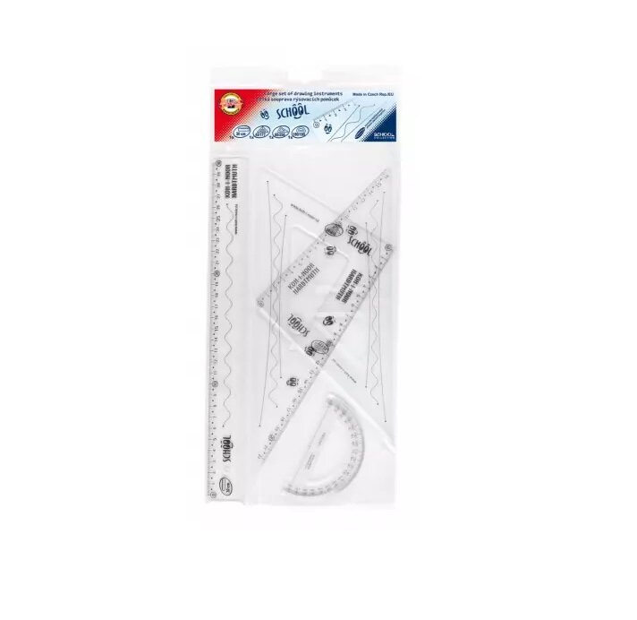 Чертежные и измерительные инструменты Koh-I-Noor - эталон высочайшего качества и точности измерений. Предназначены для школьников, студентов и инженеров. Элементы геометрического набора Koh-I-Noor изготовлены из высококачественного прозрачного полистирола. Шкалы печатаются с использованием точной технологии трафаретной печати. Печать устойчива к износу при обычном использовании. Точность шкалы длины составляет 0,2 % от длины.
