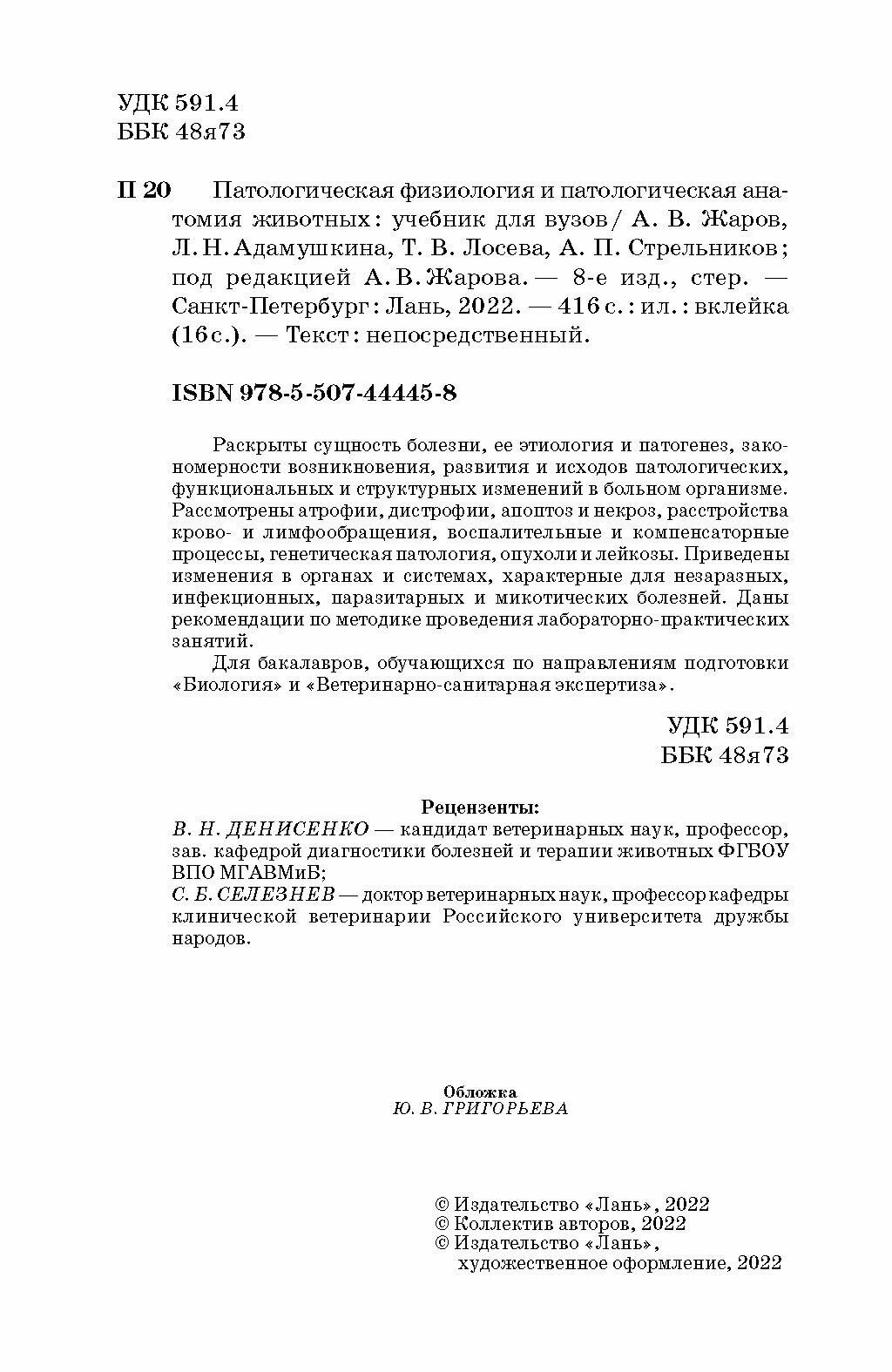 Патологическая физиология и патологическая анатомия животных (Жаров Александр Васильевич, Адамушкина Людмила Николаевна, Лосева Татьяна Владимировна); Лань, 2022
