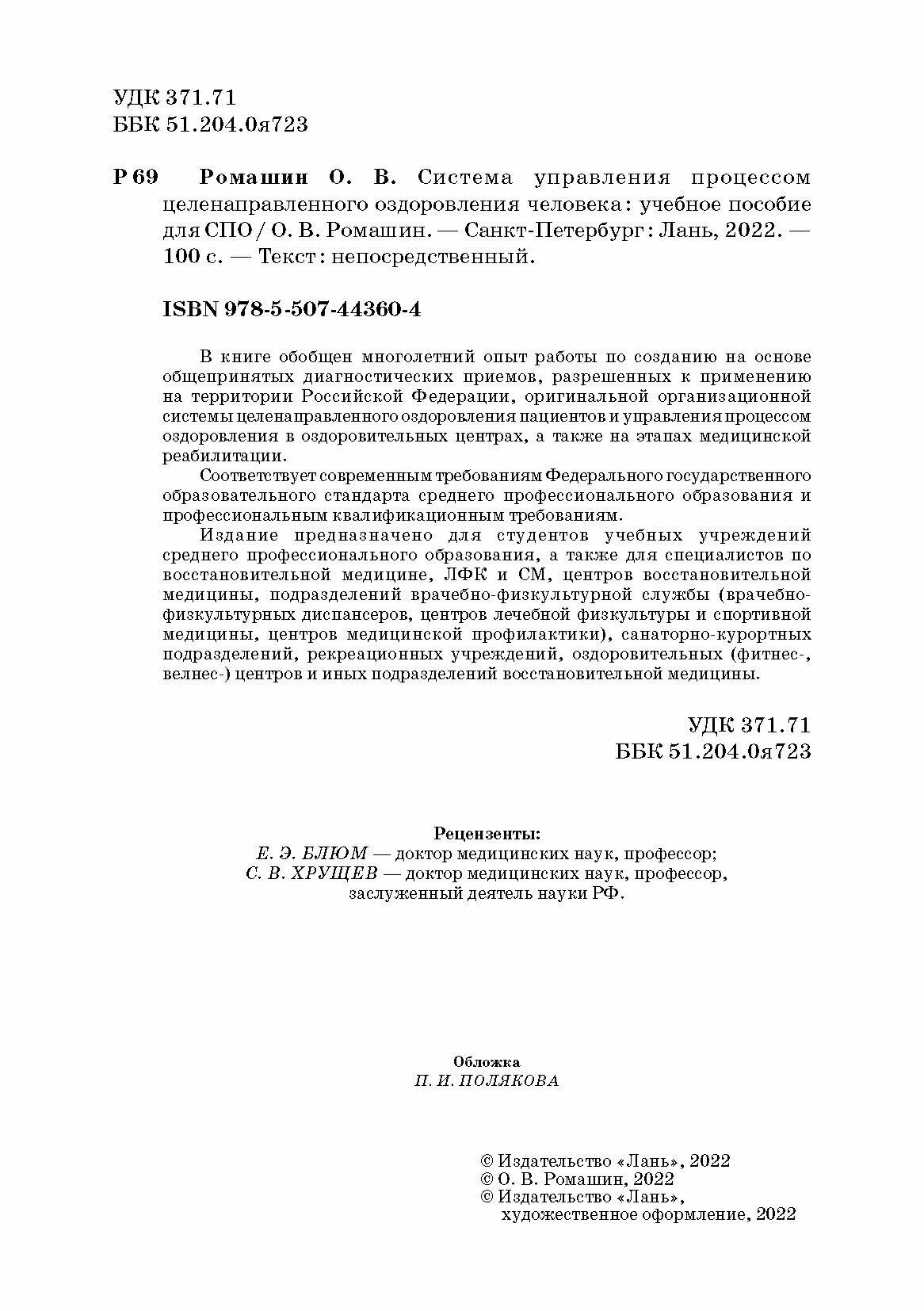 Система управления процессом целенаправленного оздоровления человека. Учебное пособие для СПО (Ромашин Олег Васильевич); Лань, 2022