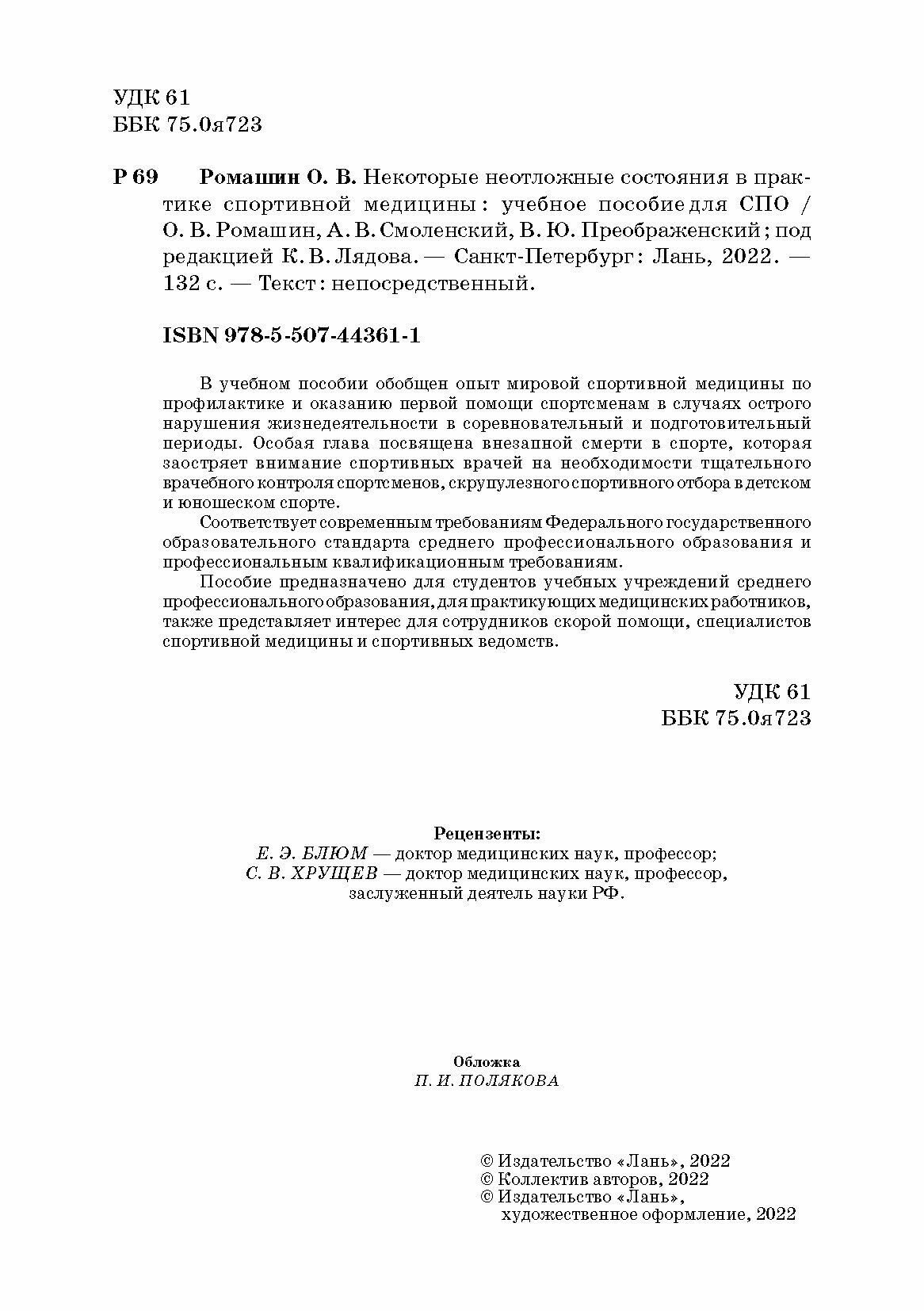 Некоторые неотложные состояния в практике спортивной медицины. Учебное пособие для СПО (Ромашин Олег Васильевич, Преображенский Владимир Юрьевич, Смоленский Андрей Вадимович); Лань, 2022