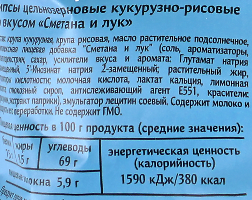 Состав: Крупа кукурузная, крупа рисовая, масло подсолнечное высокоолеиновое, комплексная пищевая добавка "Сметана и лук" (соль, лактоза, цельное сухое молоко, сахароза, сывороточный порошок, усилитель вкуса и аромата глутамат натрия 1-замещенный, лук порошок), эмульгатор лецетин соевый.