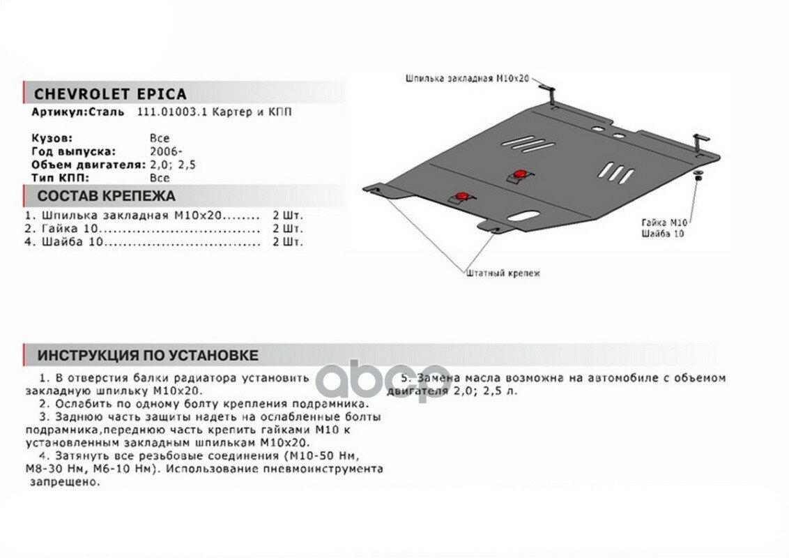 Защита картера и КПП Автоброня Chevrolet Epica, V - 2,0; 2,5 2006-2012, сталь 2 мм., комплект крепежа,
