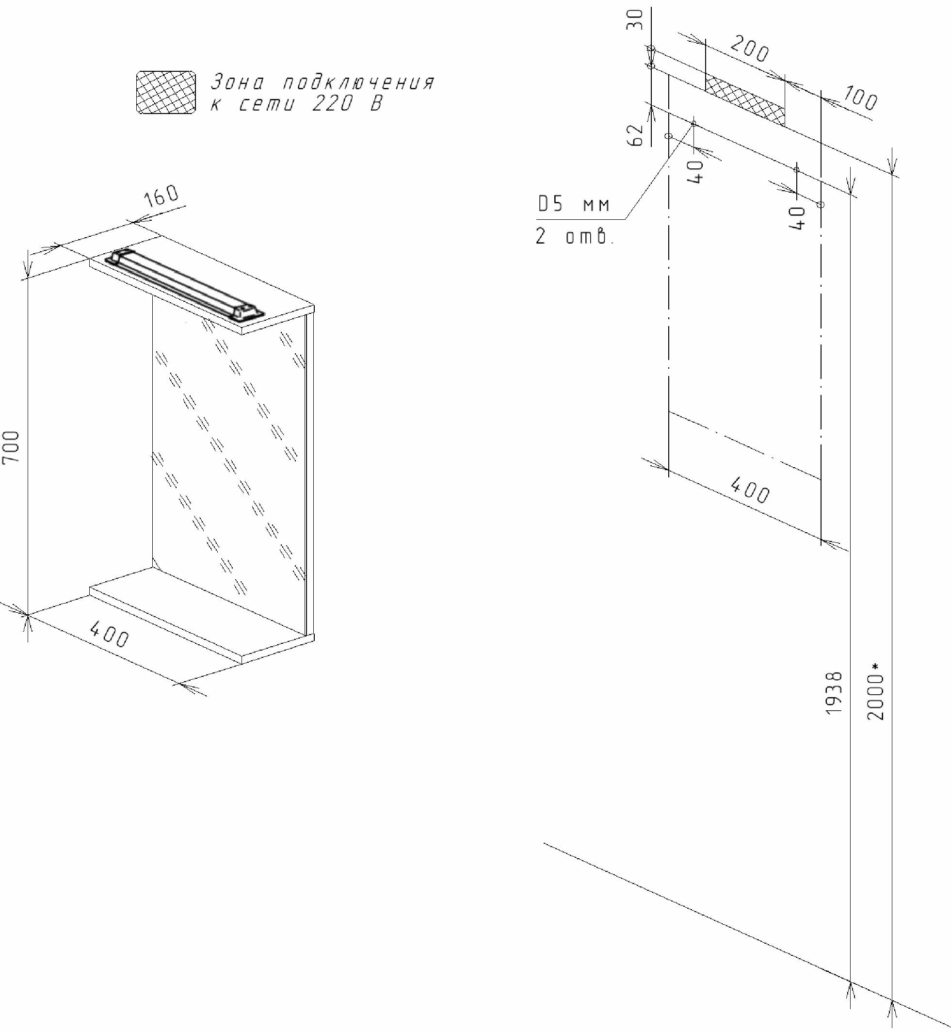 | Дополнительная информация | Зеркальное полотно, полка, подсветка. Навешивается на нерегулируемые навесы. Светильники врезные светодиодные LED, блок с розеткой и выключателем (Фазатоп). |