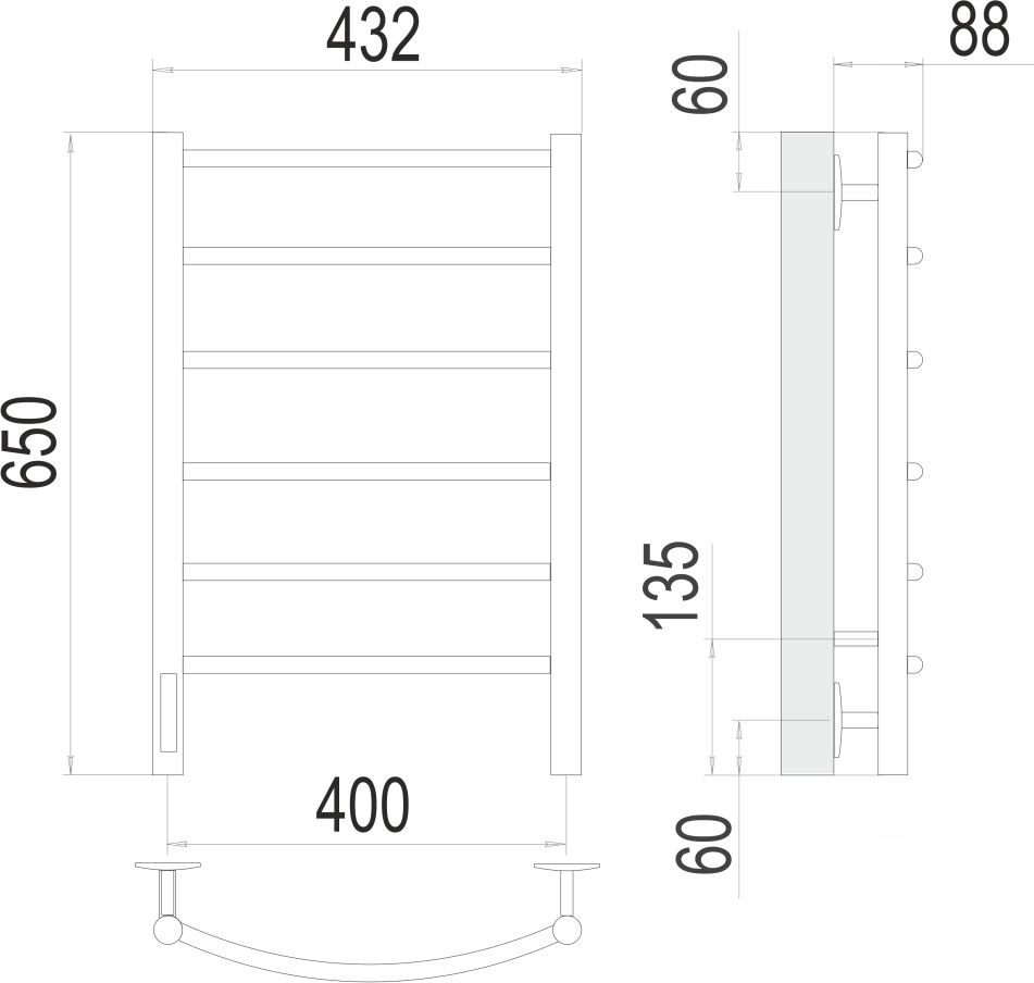 Электрический полотенцесушитель Terminus Классик 650х400 левый. Комплектация: крепления телескопические. Модуль скрытого подключения со съемной кабель-вилкой.