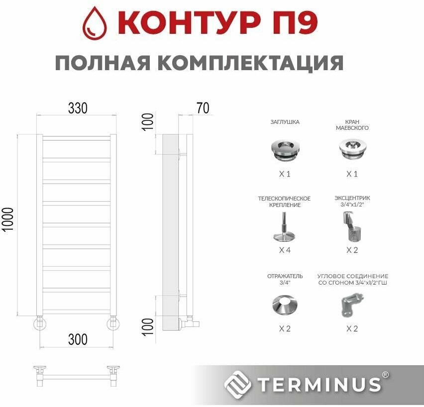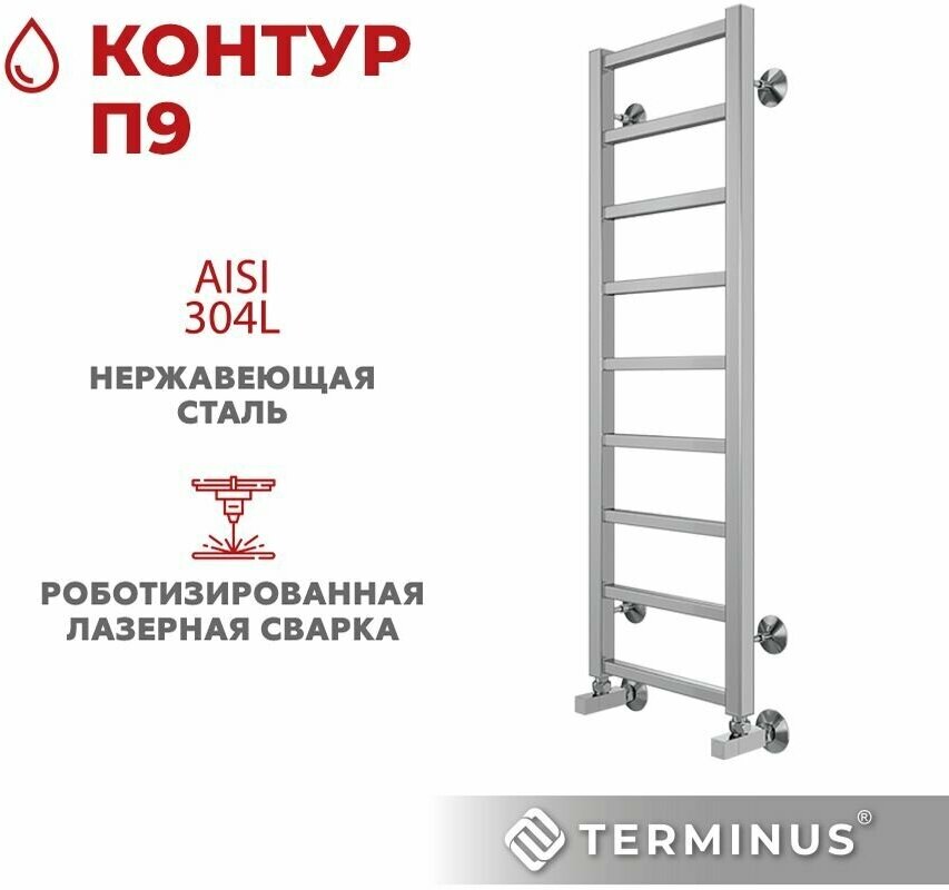 Полотенцесушитель Terminus (Терминус) Контур П9 300х1000мм, нижнее подключение 300мм, водяной - изящный элемент декора ванной комнаты, который несет в себе удобство и комфорт. Возможное подключение: нижнее. Изготовлен из пищевой нержавеющей стали AISI 304L, не подвергается к окислению металла и коррозии. Плазменная полировка полотенцесушителей Терминус (Terminus) с высоким классом чистоты-12, обеспечивает зеркальную и гигиеническую поверхность, которая не потускнеет в течение всего срока эксплуатации. Полотенцесушитель изготавливается методом роботизированной лазерной сварки, что гарантирует стойкость к гидроударам, эстетичность шва, максимальную прочность и герметичность изделия. Толщина стенки используемой трубы 2мм. Благодаря высокой теплоотдаче изделие высушит несколько полотенец за 37 минут. Вид подключения - к закрытой системе отопления, к системе горячего водоснабжения. Рабочее давление 3-15 Атм. Теплоотдача 313 Вт/ч. В комплекте всё необходимое для установки изделия.