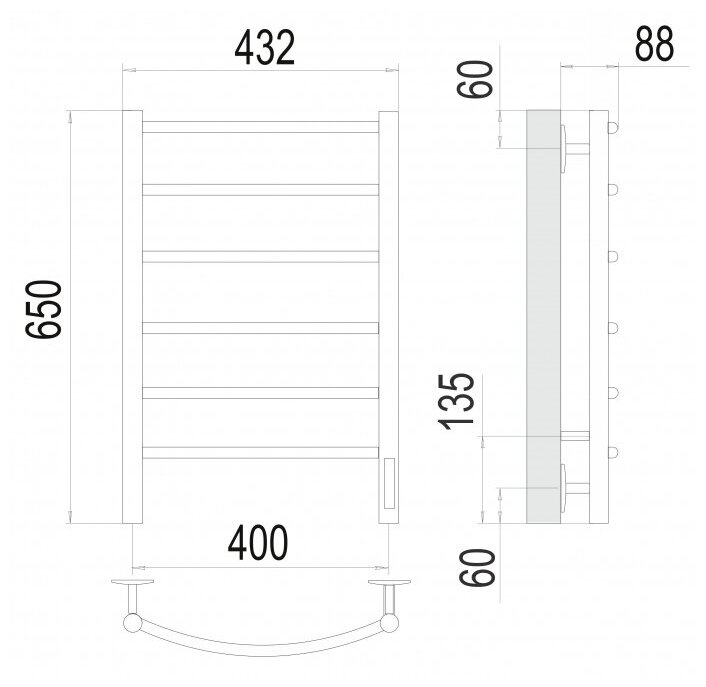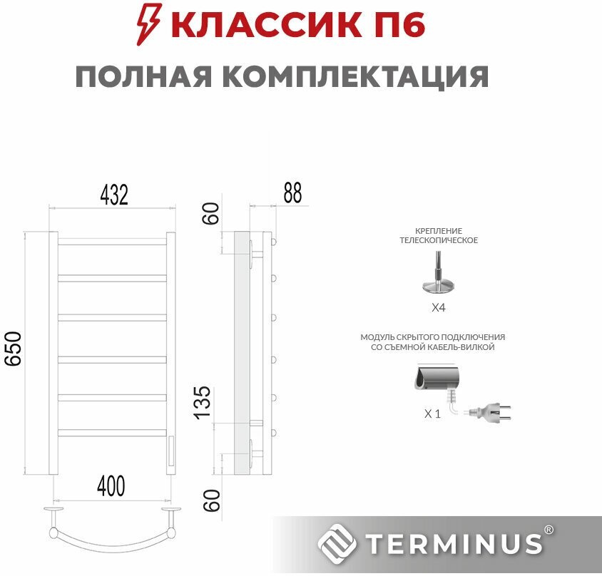 Электрический полотенцесушитель Terminus Классик 600х400 . Комплектация: крепления телескопические. Модуль скрытого подключения со съемной кабель-вилкой.