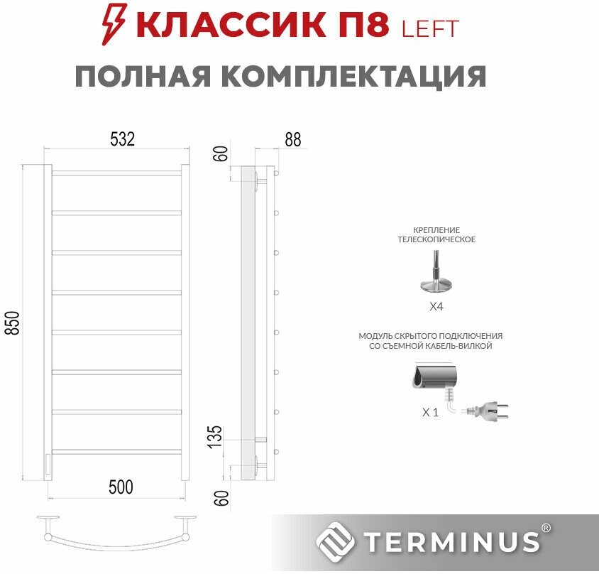 Электрический полотенцесушитель Terminus Классик 850х500 левый. Комплектация: крепления телескопические. Модуль скрытого подключения со съемной кабель-вилкой.