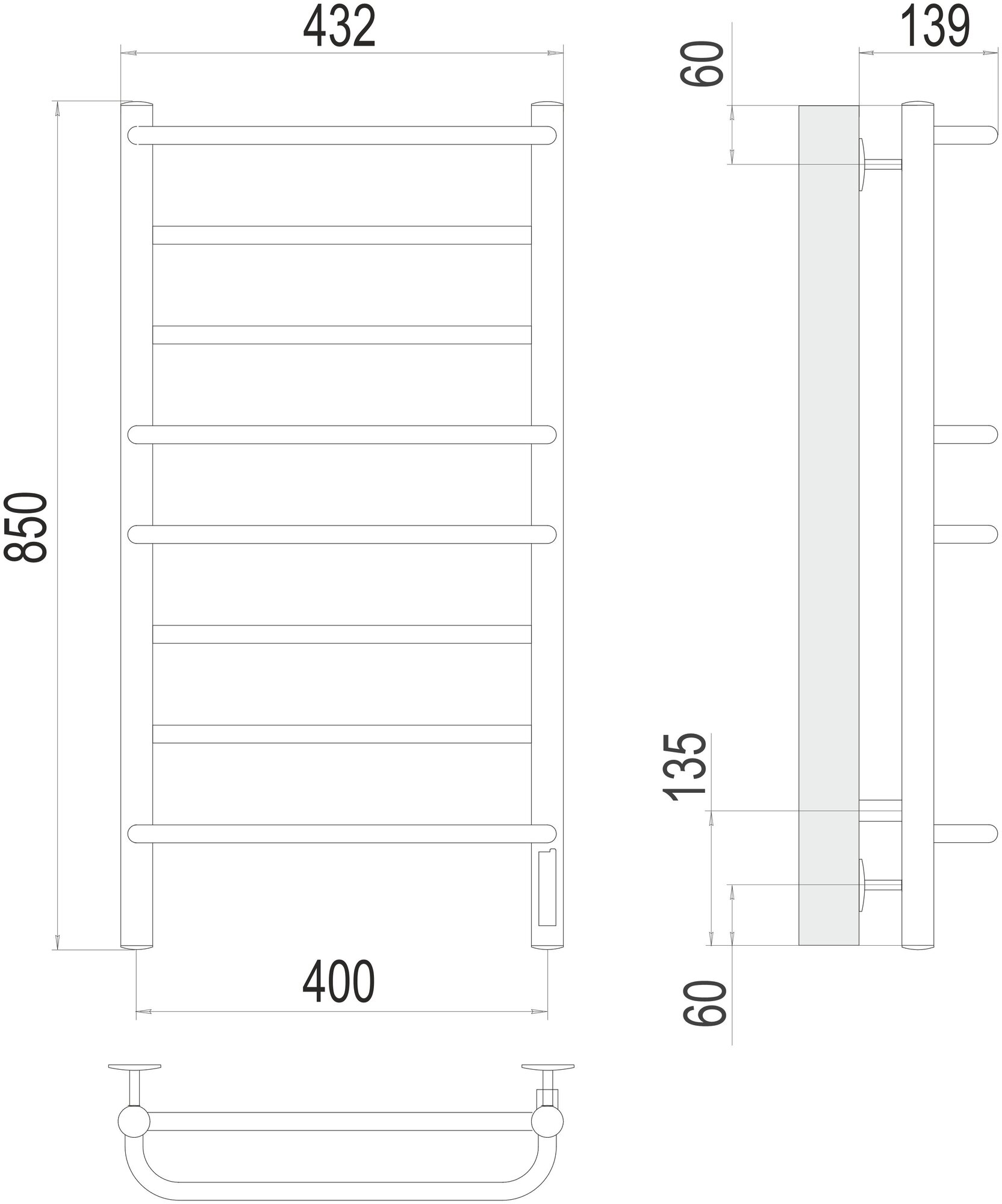 Электрический полотенцесушитель Terminus Евромикс 850х400 . Комплектация: крепления телескопические. Модуль скрытого подключения со съемной кабель-вилкой.