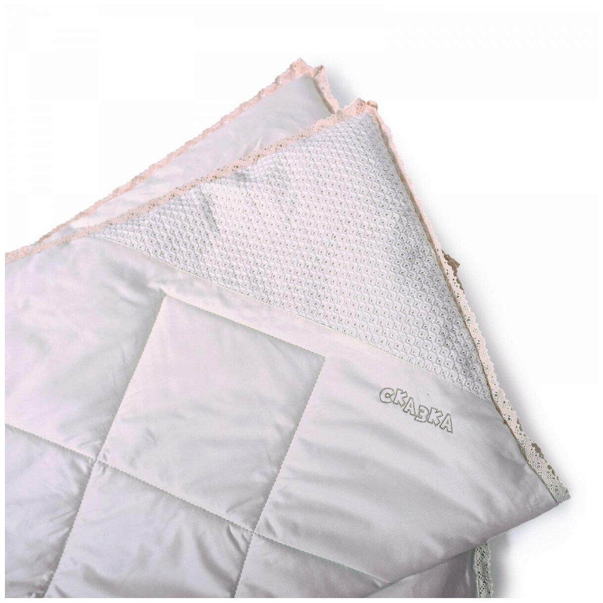 Отличительной особенностью одеяла является кружевной кант, уголок из перфорированной ткани и нежный сливочный цвет.