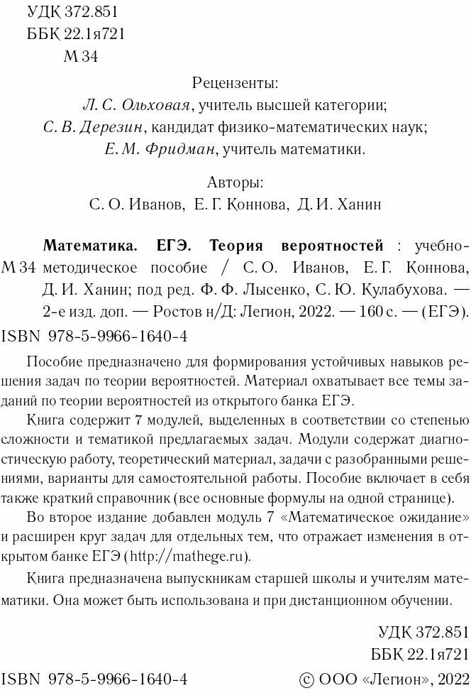 ЕГЭ Математика. Теория вероятностей (Иванов Сергей Олегович, Коннова Елена Генриевна, Ханин Дмитрий Игоревич); Легион, 2022