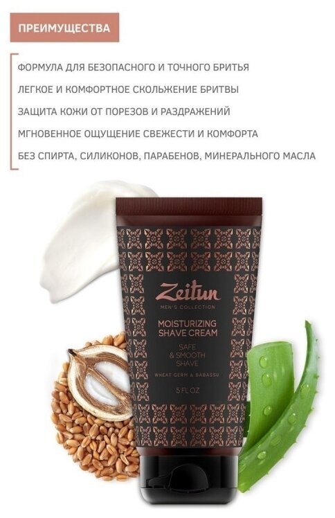 Подарите себе безопасное бритье и безупречно “гладкий” результат с кремом для бритья Zeitun. Благодаря экстра-мягкой кремовой текстуре крем легко и равномерно распределяется по коже, обеспечивает легкое скольжение бритвы и позволяет сбривать даже самые труднодоступные волоски, при этом надежно защищая кожу от порезов и повреждений. Ухаживающая формула на основе масел зародышей пшеницы и бабассу, алоэ, витамина Е и пантенола эффективно предотвращает раздражения и покраснения, питает и смягчает кожу, обеспечивает ощущение комфорта и свежести. Подходит для чувствительной кожи. Способ применения: нанесите на влажное лицо, побрейтесь, смойте теплой водой. Хранить при температуре 5°-25°C. внимание: возможна индивидуальная непереносимость натуральных компонентов. Перед применением протестируйте на небольшом участке кожи.