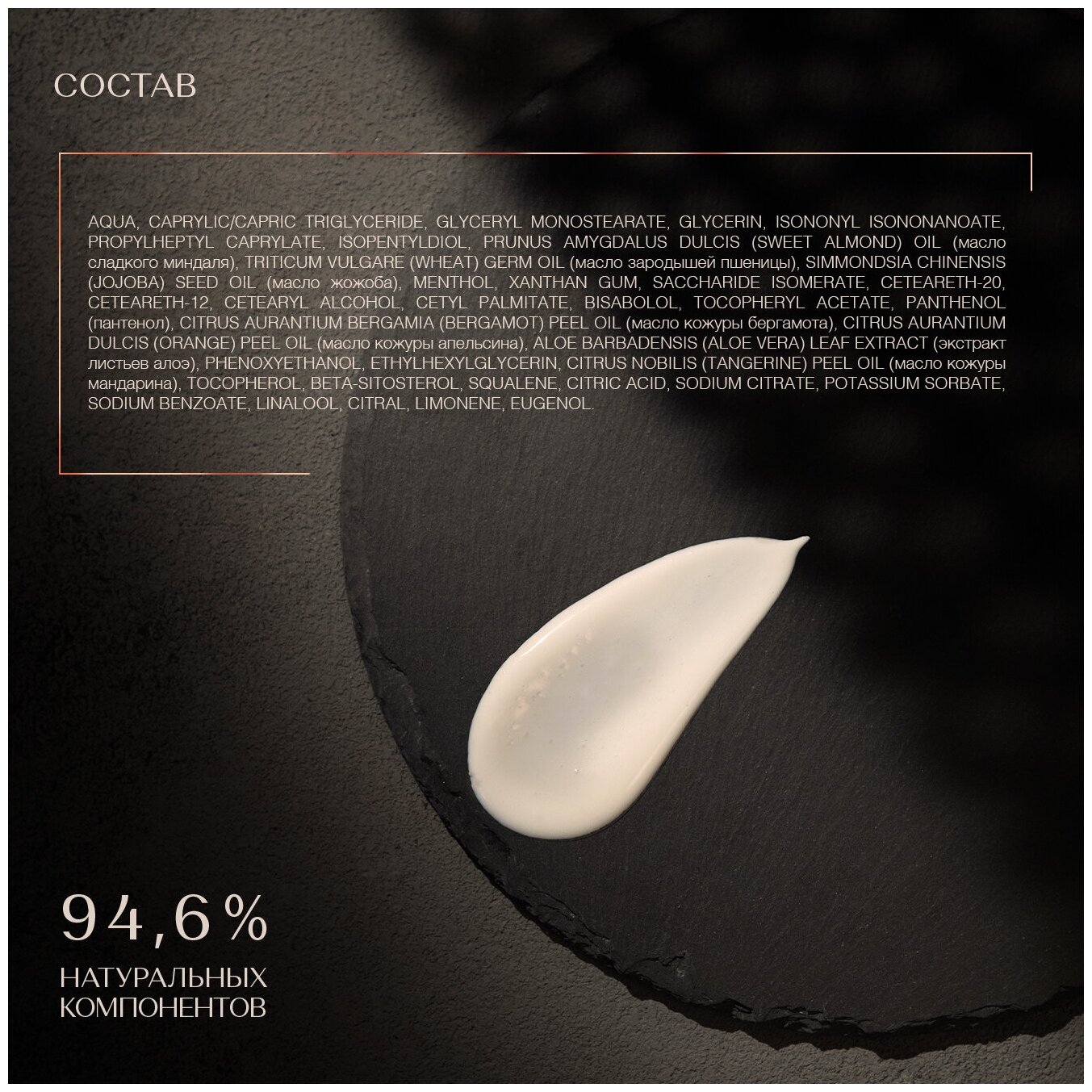 | Состав | Aqua, Caprylic/Capric Triglyceride, Glyceryl Monostearate, Glycerin, Isononyl Isononanoate, Propylheptyl Caprylate, Isopentyldiol, Prunus Amygdalus Dulcis (Sweet Almond) Oil, Triticum Vulgare (Wheat) Germ Oil, Simmondsia Chinensis (Jojoba) Seed Oil, Menthol, Xanthan Gum, Saccharide Isomerate, Ceteareth-20, Ceteareth-12, Cetearyl Alcohol, Cetyl Palmitate, Bisabolol, Tocopheryl Acetate, Panthenol, Citrus Aurantium Bergamia (Bergamot) Peel Oil, Citrus Aurantium Dulcis (Orange) Peel Oil, Aloe Barbadensis (Aloe Vera) Leaf Extract, Phenoxyethanol, Ethylhexylglycerin, Citrus Nobilis (Tangerine) Peel Oil, Tocopherol, Beta-Sitosterol, Squalene, Citric Acid, Sodium Citrate, Potassium Sorbate, Sodium Benzoate, Linalool, Citral, Limonene, Eugenol |
