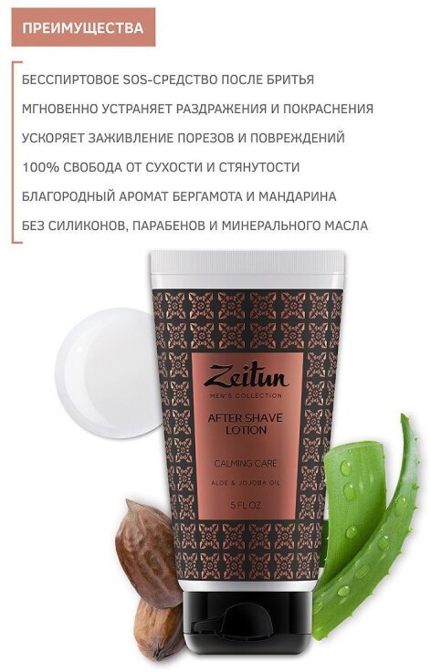 Попробуйте новый уровень ежедневного ухода после бритья с успокаивающим лосьоном от Zeitun. Натуральная ухаживающая формула без спирта с драгоценным маслом жожоба, алоэ, витамином Е и пантенолом – первая необходимость для кожи после контакта с бритвой. Средство интенсивно увлажняет и смягчает кожу, устраняет раздражения и покраснения, способствует быстрому заживлению порезов и микроповреждений, снимает ощущение сухости и стянутости, а также дарит мгновенное ощущение свежести и комфорта. Лосьон оставляет на коже свежий аромат бергамота и мандарина, который гармонично дополнит любой Ваш образ. Средство мгновенно впитывается. Не содержит силиконов, парабенов, минеральных масел. Способ применения: нанесите лосьон сразу после бритья, дождитесь впитывания. Хранить при температуре 5°-25°C. внимание: возможна индивидуальная непереносимость натуральных компонентов. Перед применением протестируйте на небольшом участке кожи.