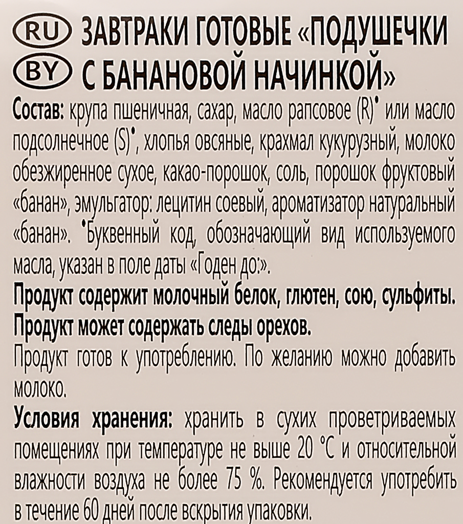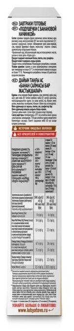 | Состав | Зерновые продукты (крупа пшеничная, хлопья овсяные, мука рисовая), сахар, масло растительное, крахмал кукурузный, молоко обезжиренное сухое, какао-порошок, соль, порошок фруктовый банан, эмульгатор |