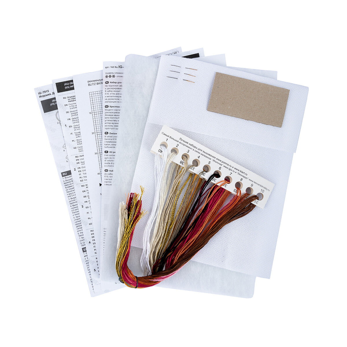 | В набор входит | канва Aida 16 белого цвета, мулине, игла, цветная символьная схема, инструкция, Картонные заготовки, Синтепон |