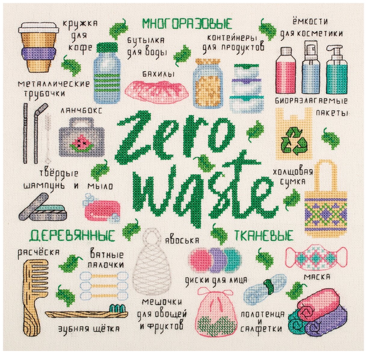В набор для вышивания "PANNA" входит: канва равномерного переплетения К27 Linda, игла для вышивания, хлопчатобумажные нитки мулине Gamma на держателе, подробная инструкция по вышиванию и цветная схема. Размер готовой работы 27.5 x 27.5 см (с учетом припусков на оформление).Общественное движение Zero Waste (дословно – «Ноль отходов») призывает людей сводить к минимуму отходы и прочий мусор. Для этого любые вещи и предметы следует использовать максимально возможное количество раз, а от многих из них просто отказываться. В основе практики Zero Waste лежит 5 основных принципов: Refuse – откажись от ненужного, Reduce – сократи потребление, Reuse – используй повторно, Recycle – перерабатывай, Rot – компостируй органику для удобрения почвы.