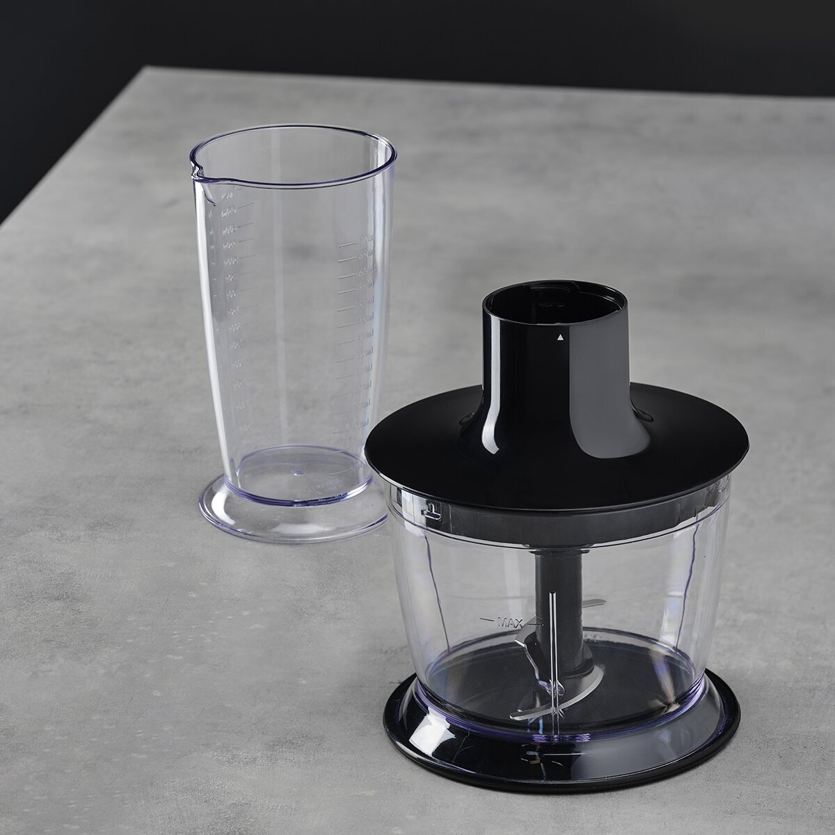 В комплекте с погружным блендером идут насадки для измельчения, приготовления пюре без комочков, мини-измельчитель, венчик для взбивания жидких продуктов в воздушную пену и мерный стакан. Съёмные насадки после каждого использования можно мыть в посудомоечной машине.