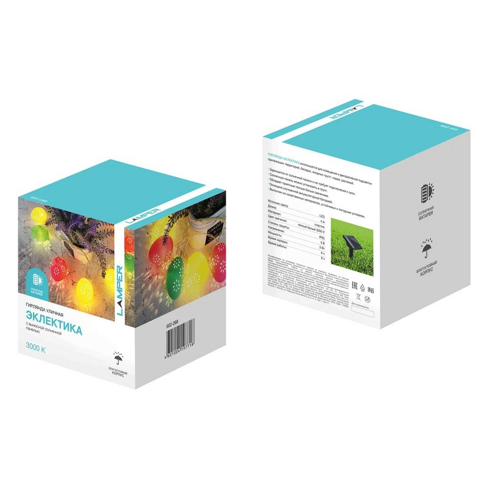 Каскад Lamper Эклектика с солнечной панелью и аккумулятором оживляет любое пространство и создает неповторимую атмосферу уюта. Уникальный дизайн хай-тек привнесет новые яркие акценты и украсит любое пространство своим лаконичным и оригинальным дизайном, а приятное теплое белое свечение будет радовать долгое время благодаря прочной конструкции и долговечным LED диодам. Высокая степень IP защищает от замыкания при попадании влаги на устройство. Каскад Lamper – идеальное устройство для декоративного уличного освещения, не требующее прокладки проводов и дополнительных элементов установки. Технические характеристики: Мощность: 3 Вт Напряжение: 5 В Материал: пластик Тип источника света LED Цвет свечения: теплый белый 3000 К Степень защиты: IP65 Время зарядки: 6 ч Время работы: 6 ч Длина: 6 м