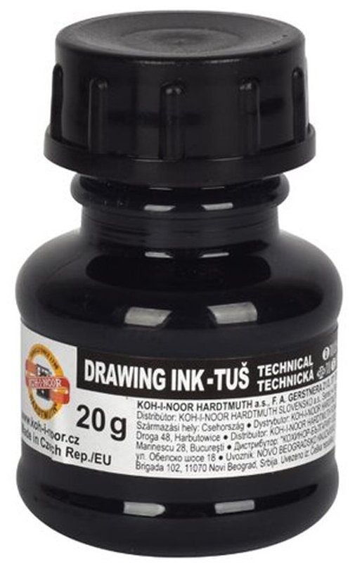 Тушь Koh-I-Noor акриловая на водной основе. Не засохшая тушь смывается водой, но при высыхании образует прочную водоустойчивую пленку. Туши разных цветов хорошо смешиваются между собой. В крышку флакона встроена специальная палочка для нанесения туши. Предназначена для письма и рисования на бумаге и картоне кистью или пером. Перед использованием тушь следует тщательно взболтать.