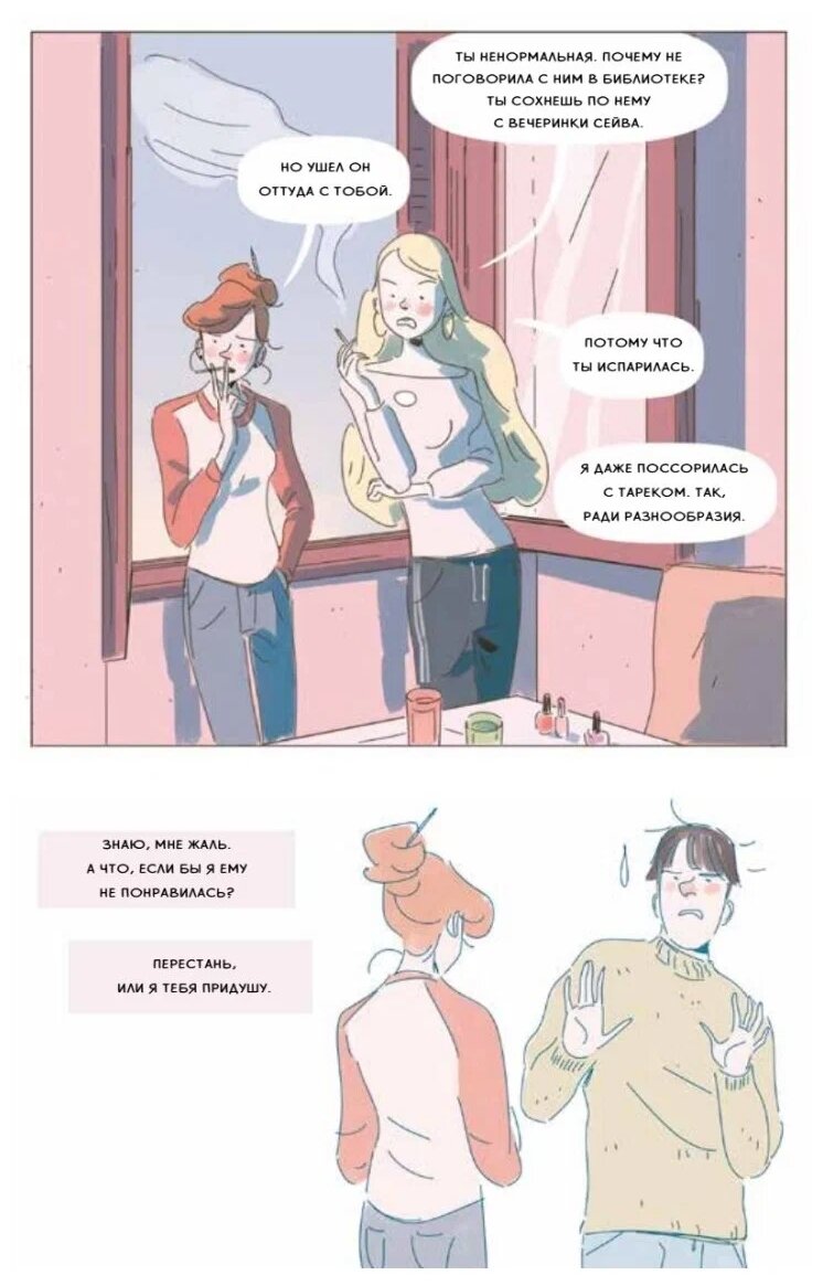 Классный европейский комикс про студенческую атмосферу и отношения. Интересная структура книги, очевидная из иллюстрации на обложке - главный персонажи одной из истории появляются в следующей уже в качестве второстепенных. Можно сказать, напоминает сериал Хор - у каждого есть своя сюжетная арка, но при этом она может пересекаться с сюжетной аркой других героев.