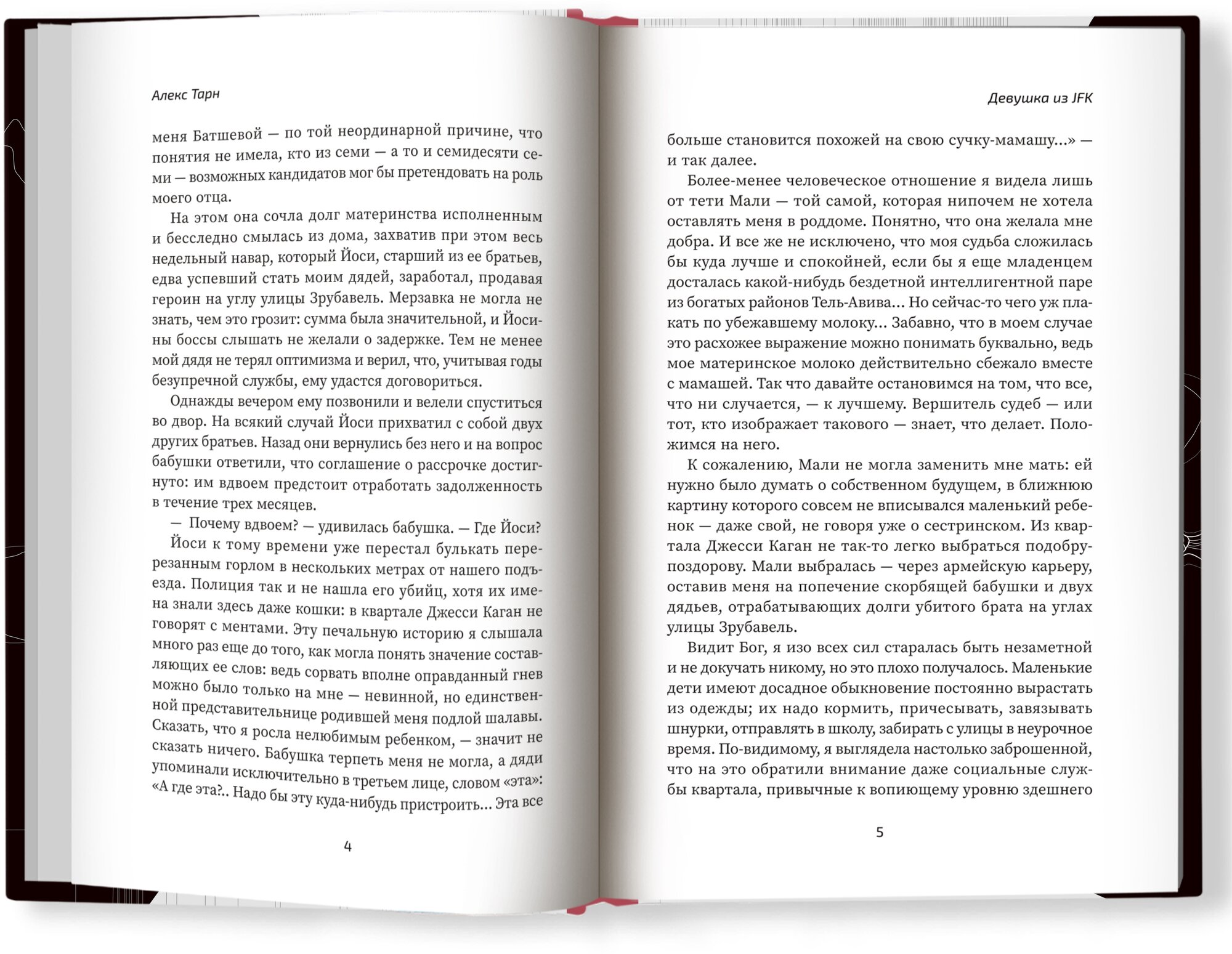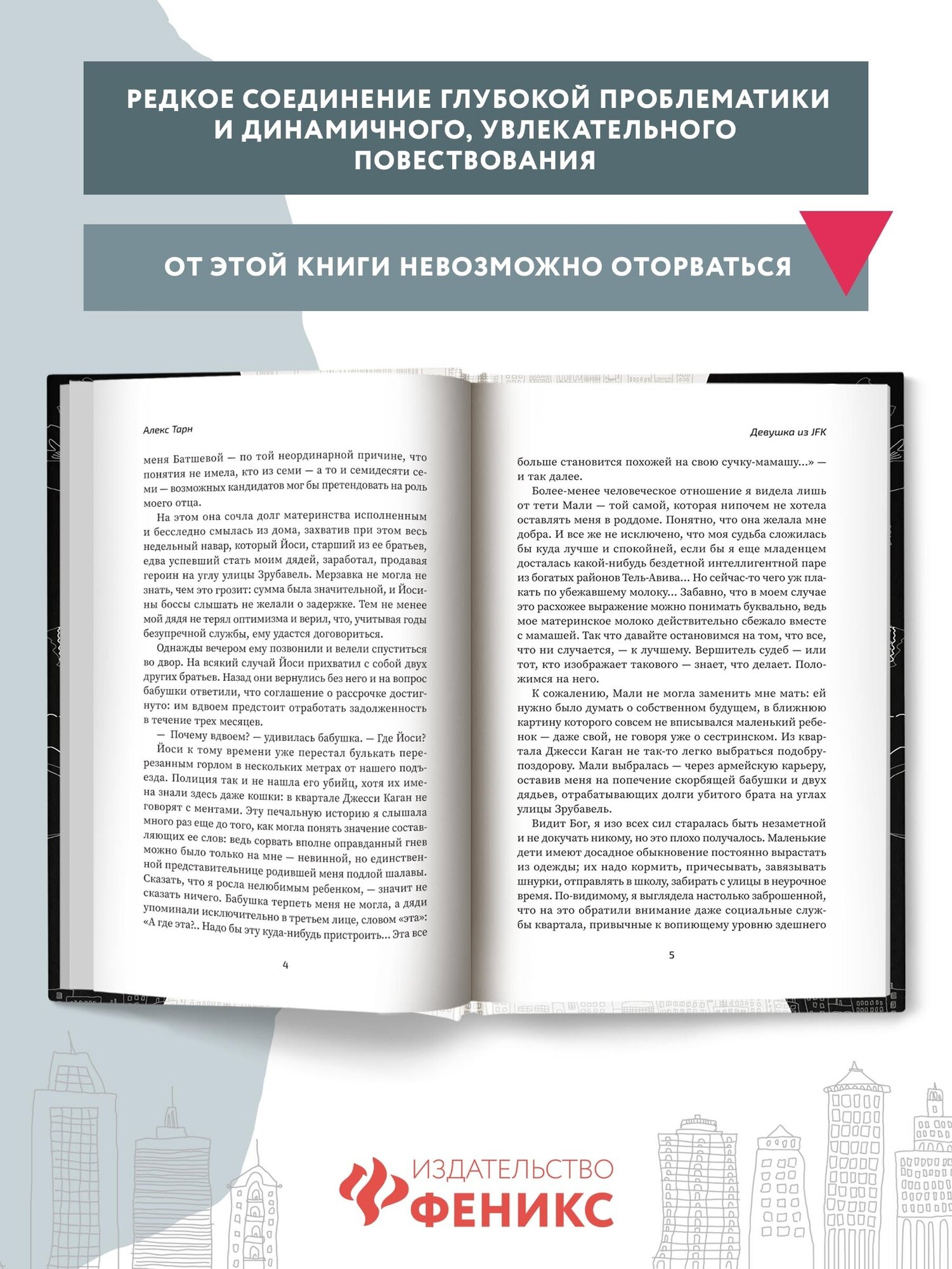 Неожиданная книга! О свинцовых мерзостях российской жизни написана уйма книг. И порой кажется, что они есть только у нас. Меняет взгляд на их локацию роман "Девушка из JFK" А.Тарна. Оказывается, и там, в благополучном Израиле, их несмнетное количество. Но - вот парадокс! - главная героиня все-таки не жертва, не Сонечка Мармеладова. А натура дейтельная. И так отрадно, что человек выкарабкивается со дна жизни. Написано увлекательно, ярко. Рекомендую!
