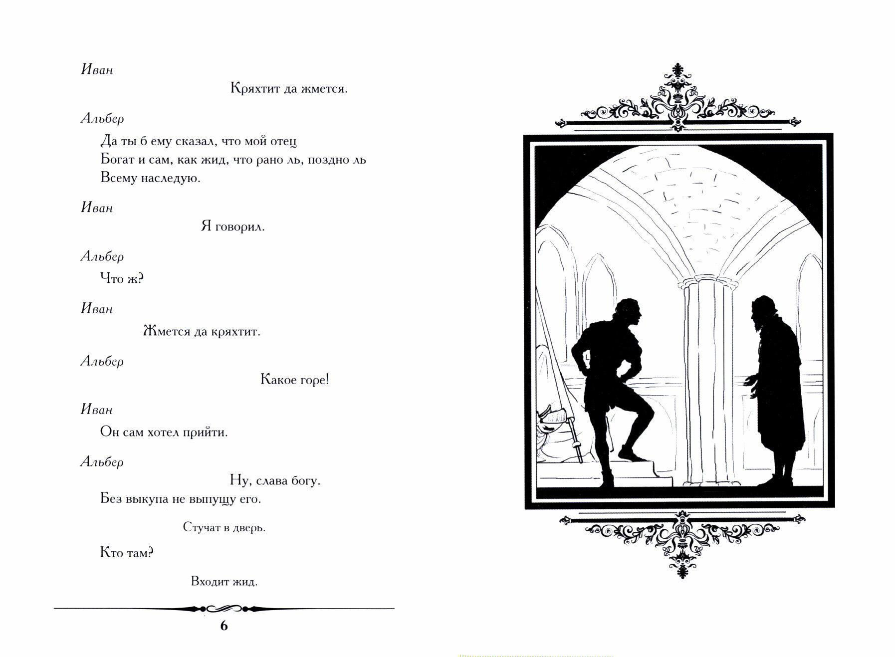 Издание содержит полный текст "маленькой трагедии" А. С. Пушкина "Скупой рыцарь" с замечательными силуэтными иллюстраци-ями А. А. Ростовой.