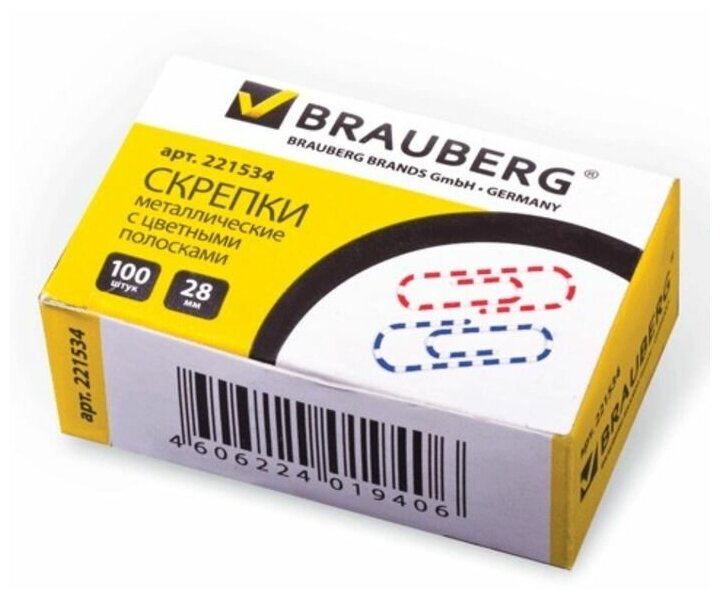 Скрепки изготовлены из стали, имеют классическую овальную форму и цветное пластиковое покрытие в полоску. Длина скрепки составляет 28 мм. Не окисляются и не повреждают документы. 100 штук в картонной коробке.