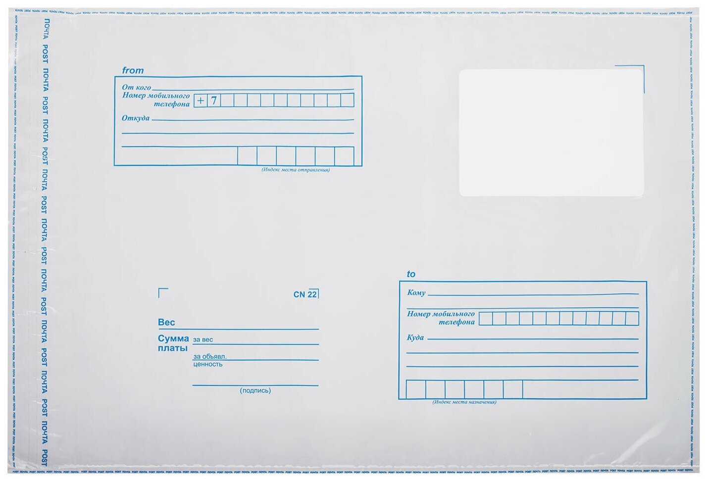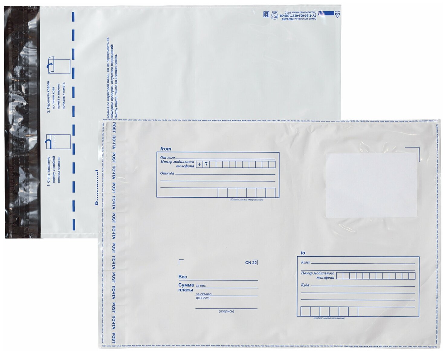 На передней стороне конверта имеются адресные указатели: «От кого», «Откуда», «Кому», «Куда». Отрывная полоса типа STRIP обеспечивает легкое запечатывание пакета. Поставляются по 50 штук в упаковке.
