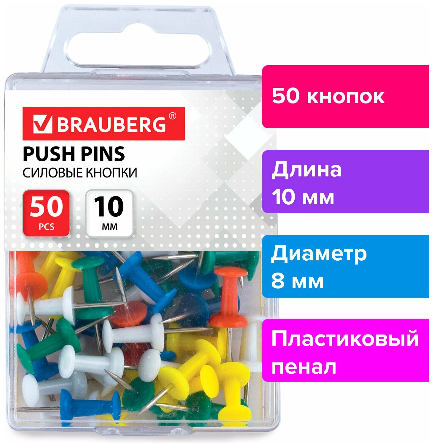 Кнопки с цветной пластиковой шляпкой диаметром 8 мм и стальным острием длиной 10 мм. 50 штук в пластиковой коробке с европодвесом.