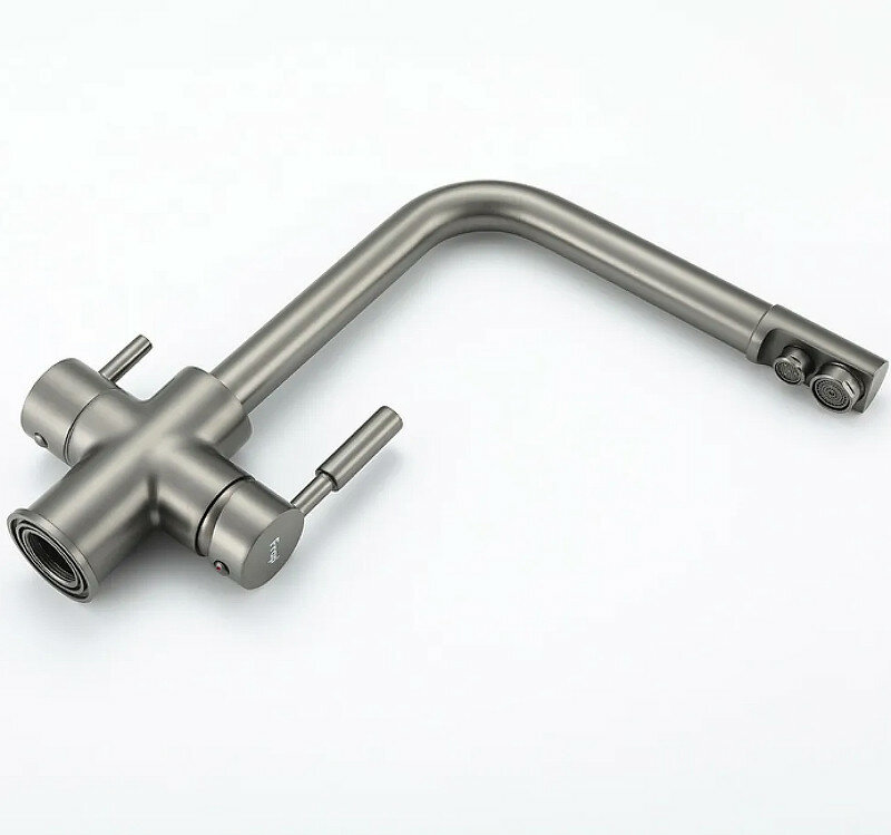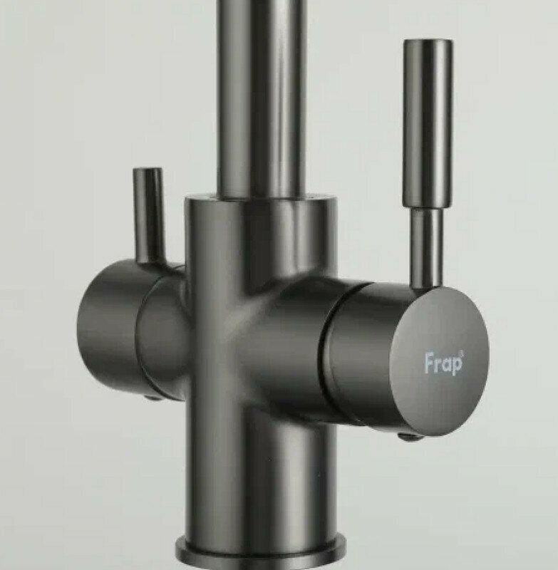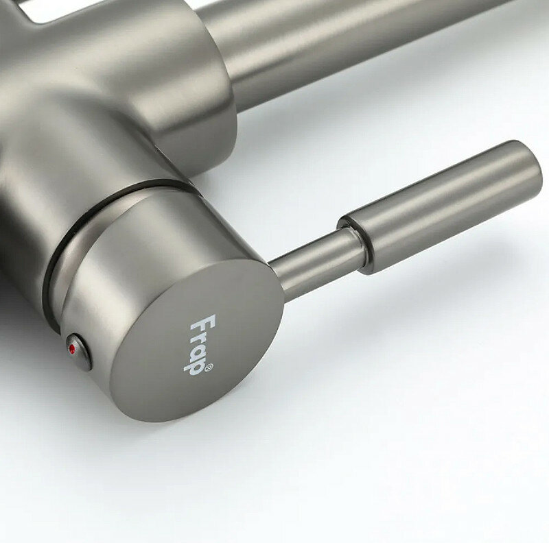 Смеситель для кухни с подключением фильтра для воды FRAP F4352. Удобство этой модели заключается в том, что в одном корпусе с современным дизайном конструкторы поместили обычный смеситель с подведением горячей и холодной воды и смеситель от фильтра для питьевой воды. В комплекте три гибкие подводки длиною 400 мм с полудюймовыми гайками. Корпус из латуни с покрытием, однорычажный переключатель воды, керамический дисковый картридж Ф 40 мм, поворотный излив.