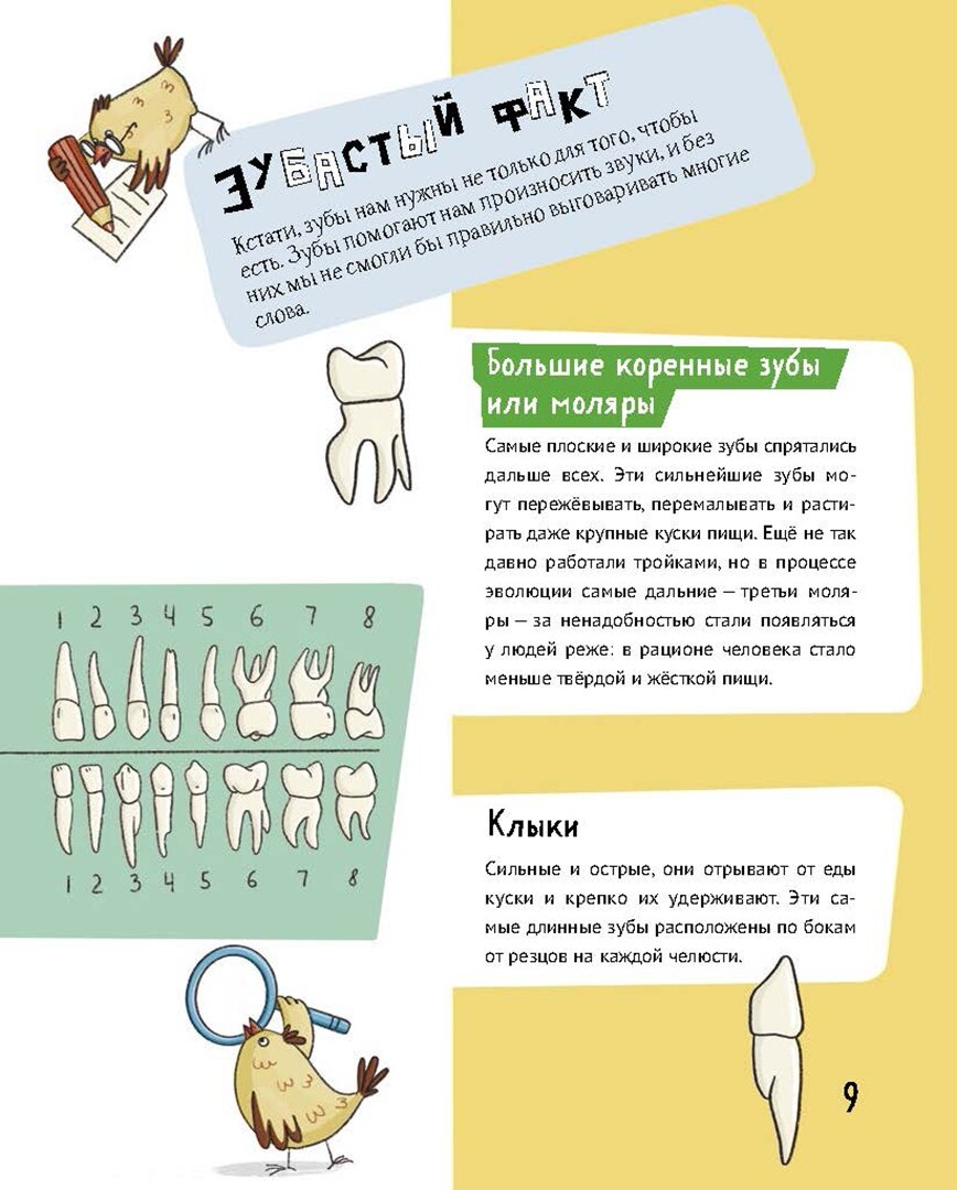 Купила для общего развития ребенка книгу про зубы. Теперь хочу порекомендовать ее другим читателям. Во-первых, книга охватила почти все, что можно рассказать о зубах. В ней 4 раздела: научные факты о зубах, исторические факты, забавные и удивительные факты и раздел о приборах для зубов. Все рассказано подробно, но без занудства. Во-вторых, смешные иллюстрации. С одной стороны, они здорово разбавляют серьезную информацию, а с другой, наглядно показывают, как выглядят зубы снаружи и внутри или как выглядели первые брекеты. В книге есть напоминалка, как правильно чистить зубы. В чем ее плюс – сама она нарисована в виде комикса, а в тексте на странице подробно расписано, что будет, если не чистить зубы. Без лишних запугиваний, только факты, но на моего ребенка подействовало отлично!