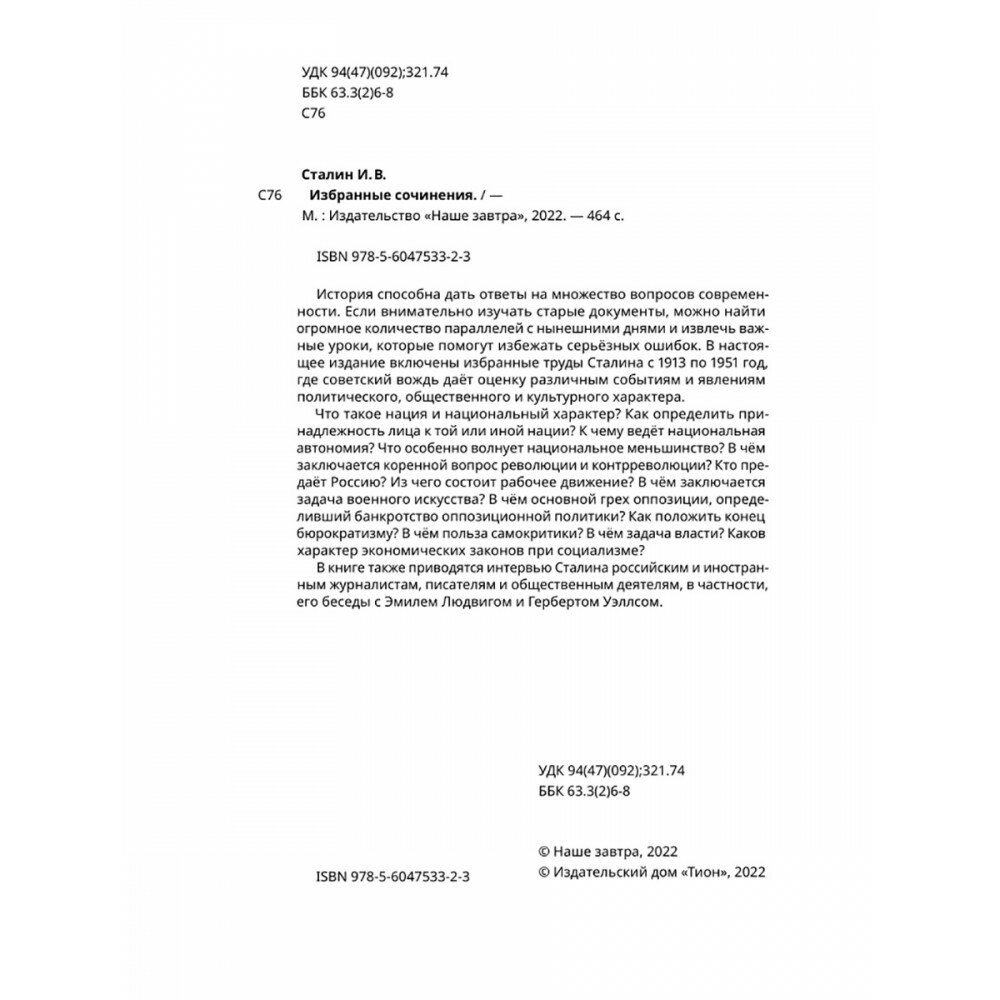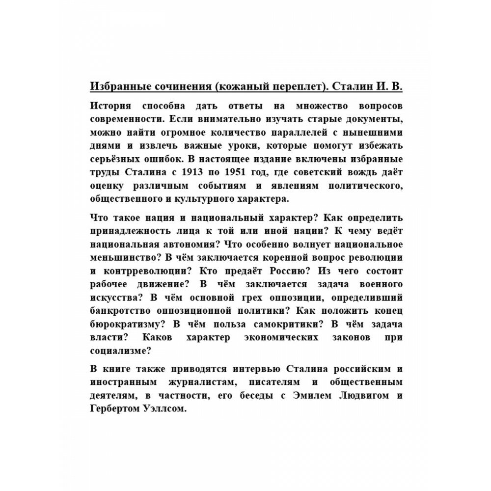 История способна дать ответы на множество вопросов современности. Если внимательно изучать старые документы, можно найти огромное количество параллелей с нынешними днями и извлечь важные уроки, которые помогут избежать серьёзных ошибок. В настоящее издание включены избранные труды Сталина с 1913 по 1951 год, где советский вождь даёт оценку различным событиям и явлениям политического, общественного и культурного характера. Что такое нация и национальный характер? Как определить принадлежность лица к той или иной нации? К чему ведёт национальная автономия? Что особенно волнует национальное меньшинство? В чём заключается коренной вопрос революции и контрреволюции? Кто предаёт Россию? Из чего состоит рабочее движение? В чём заключается задача военного искусства? В чём основной грех оппозиции, определивший банкротство оппозиционной политики? Как положить конец бюрократизму? В чём польза самокритики? В чём задача власти? Каков характер экономических законов при социализме? В книге также приводятся интервью Сталина российским и иностранным журналистам, писателям и общественным деятелям, в частности, его беседы с Эмилем Людвигом и Гербертом Уэллсом.