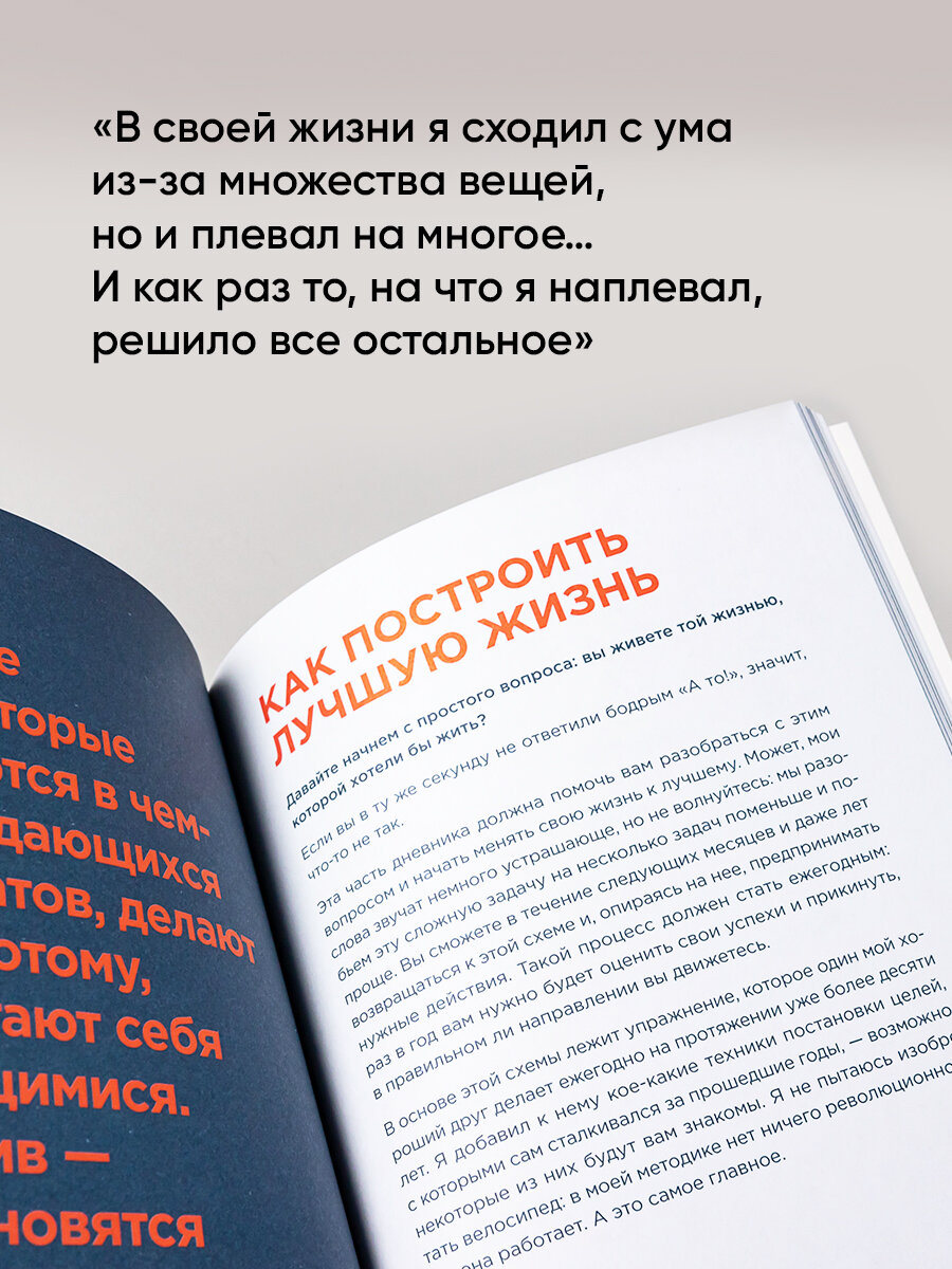 Готовых решений и волшебных рецептов в дневнике не найти. Зато на его страницах достаточно места, чтобы вы как следует поразмыслили о своих взлетах и падениях, подготовили план действий на будущее и составили пару симпатичных списков (в том числе и список фигни, на которую можно забить). А главное — никто, включая автора, не будет вам ничего навязывать. Вы сами научитесь принимать неизбежность проблем, перестанете идти на поводу у своих эмоций, разберетесь, на что тратите свое время, и поймете, о чем стоит беспокоиться, а на что можно и наплевать. Ведь цель этого дневника — помочь вам овладеть тонким искусством пофигизма.