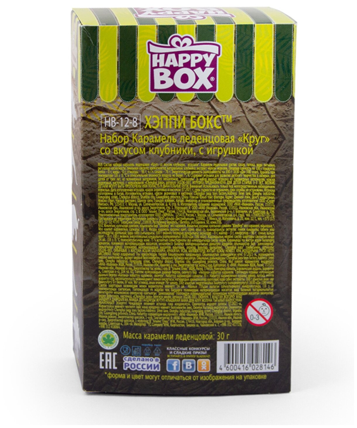 Набор Happy Box «Динозавры» состоит из большой белой фигурки динозавра, которую можно раскрашивать и набора для рисования с красками и кисточкой. Всего в коллекции 6 больших фигурок. Каждая размером до 15 сантиметров. Набор для рисования состоит из кисточки и красок с тремя основными цветами палитры. Основные цвета — это те, смешивая которые можно получить абсолютно любой оттенок. Как это делать написано и наглядно показано во вкладыше, который вложен к коробочку. Также на нём изображён соответствующий динозавр, попавшийся ребёнку, и даны интересные факты — в какой период он жил, его привычки, среду обитания, особенности поведения, питания и другое. Набор Happy Box «Динозавры» — отличный способ совместного препровождения ребёнка с родителями, во время которого они узнают много нового, интересного и станут ещё ближе друг к другу. В коробочке ребёнок найдёт 3 фигурных леденца на палочке в форме круга и с ярко выраженным вкусом клубники. Карамель производится на фабрике «МАК-Иваново» с использованием натуральных ингредиентов. Состав: сахар, патока, вода питьевая, регулятор кислотности: лимонная кислота; ароматизатор натуральный: клубника; экстракт черной моркови.