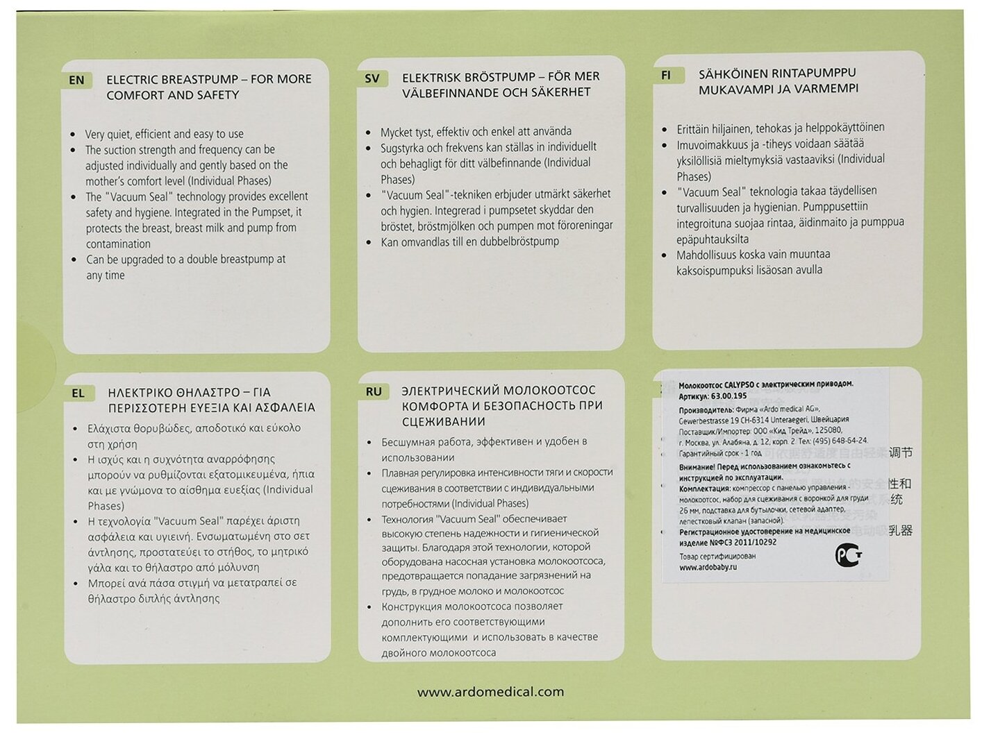 | Дополнительно | Основные характеристики электрического молокоотсоса Calypso: - Быстрое сцеживание, приближено к естественному кормлению грудью. - 64 цикла индивидуальной настройки. - Электронный дисплей с подсветкой, где отображается информация о глубине и частоте всасывания. - 400 часов работы аппарата хватит на вскармливание двоих детей. - Индикация текущего состояния (зеленый - аппарат в нормальном состоянии, оранжевый - заканчивается время гарантийной работы). - Бесшумная работа. |