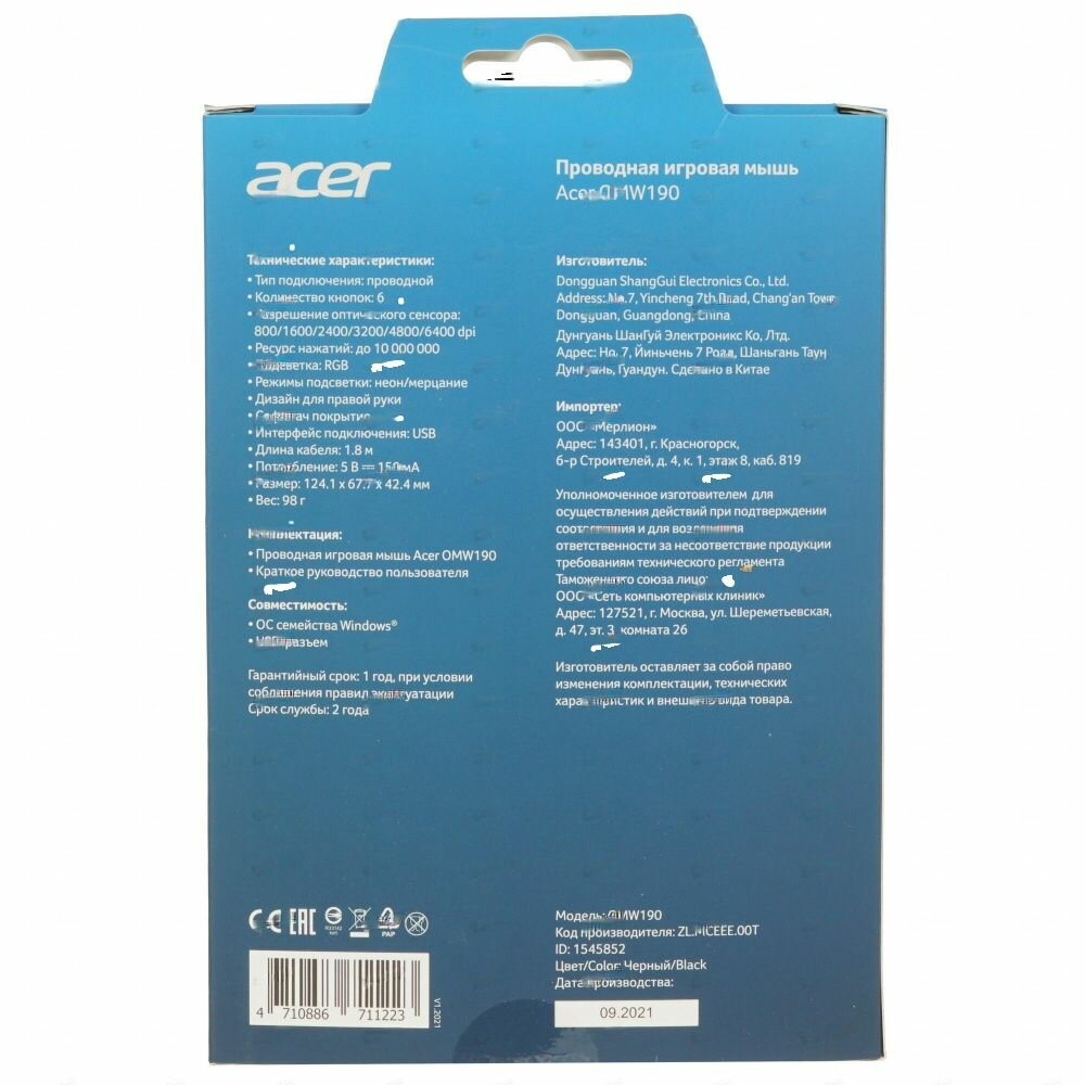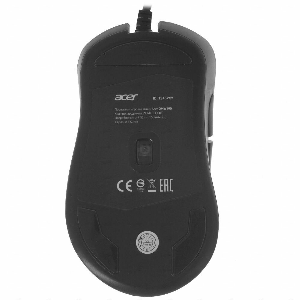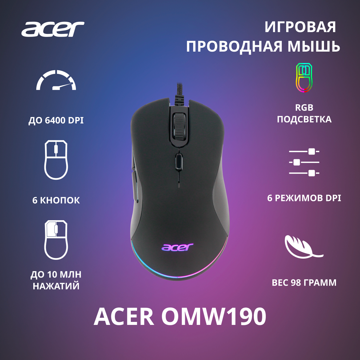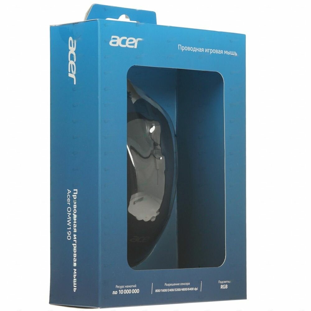 Мышь Acer черный, оптическая, разрешение сенсора 6400dpi, проводная, длина провода 1.8м, кнопок: 6, подходит для правой руки (ZL.MCEEE.00T)