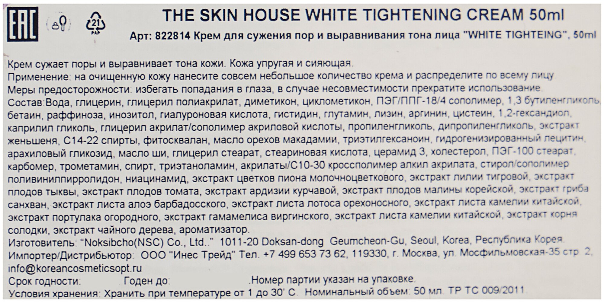 На сегодняшний день товар «Крем для сужения пор и выравнивания тона лица The Skin House White Tightening Cream 50мл (СКХ 21)» можно купить с кешбеком в 1 магазине: Яндекс.Маркет