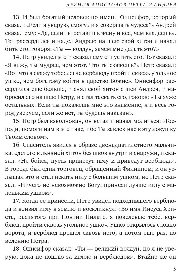 Русской Церковью признаются лишь те источники, которые носят достоверный характер. Сочинения, не вошедшие в основной корпус библейских текстов, были написаны ближайшими учениками апостолов или ими самими. Каноническими они не стали, так как не нашлось достаточно подтверждений их подлинности. В данном сборнике апокрифических сочинений помещены деяния двенадцати ближайших учеников Иисуса Христа, названных апостолами. Апокрифы повествуют о чудесах, которые они творили, познав Бога и уверовав в него. Они проповедовали и помогали страждущим. Их путь был труден и часто невыносим, и умерли они за свою веру, посмертно став мучениками Христовыми и тем самым прославив имя своего Учителя.