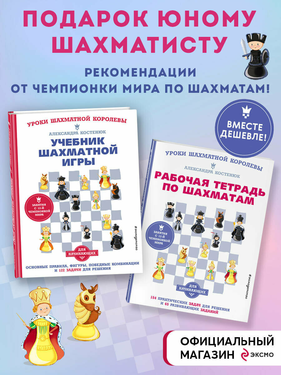 В комплекте представлены учебник и рабочая тетрадь для начинающих, написанные 12-й чемпионкой мира Александрой Костенюк и апробированные в её школе шахмат. Книги рассчитаны на обучение старших дошкольников как в специальных кружках, так и дома вместе с родителями. Доступный язык изложения, забавные иллюстрации, а также множество разнообразных заданий на внимание, логику и раскраски сделают обучение не только лёгким, но и весёлым. Тем более что дети будут узнавать азы шахмат в компании своих ровесников — любопытного Мити и жизнерадостной Маши. Учитесь шахматам с нами по методике 12-й чемпионки мира!