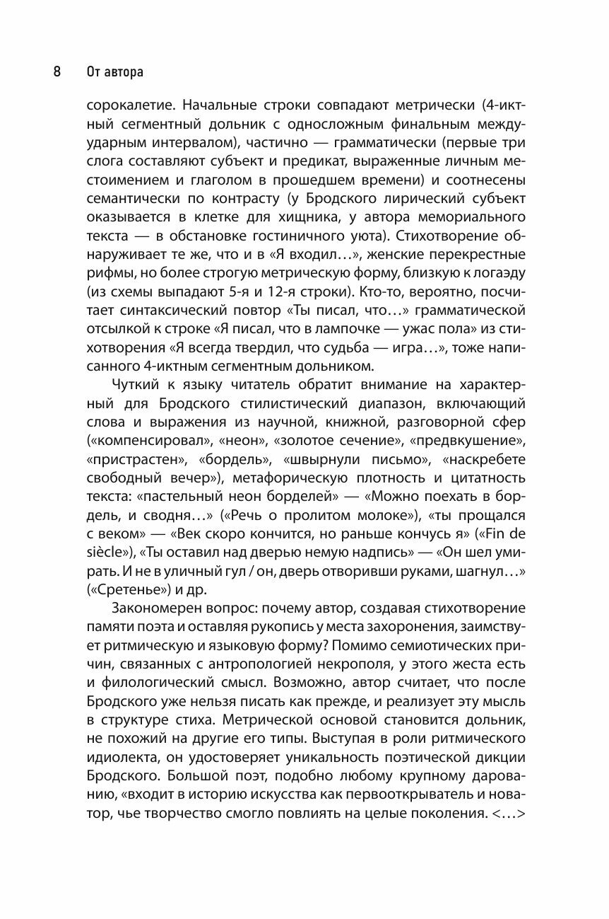 Почему поэт, начиная стихотворение, задавался вопросом М. Л. Гаспаров, выбирает именно этот размер, а не другой? Задача книги — показать, что стихотворение часто возникает как отклик на другое стихотворение, о чем поэт может не догадываться. Между тем форма стиха «помнит» о своих претекстах. Разделы книги, сложившиеся из самостоятельных статей, объединяет общий сюжет — ритмические переклички, которые связывают стихи Бродского со стихами предшественников, современников и поэтов нового поколения. Попасть в чужую дикцию, воссоздать интонацию предшественника — значит продолжить обще ние с тем, кто был и остался для автора поэтическим собеседником.