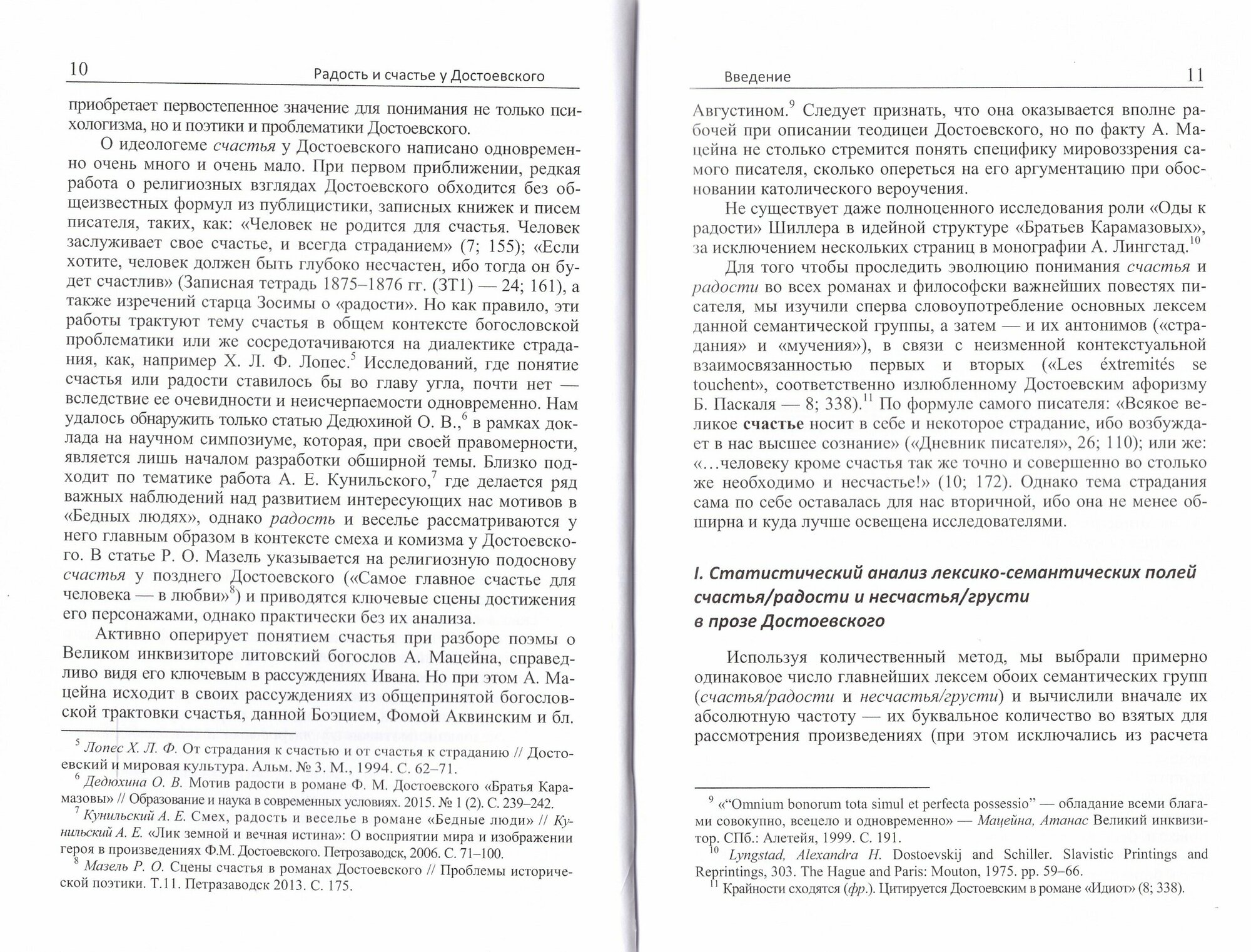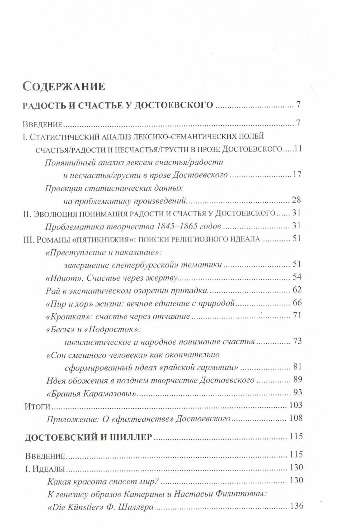 Главную часть книги составляют два тесно связанных между собой исследования: "Радость и счастье у Достоевского", обращающееся к духовной первооснове философии писателя, и "Достоевский и Шиллер", где обстоятельно, с опорой на немецкий оригинальный текст, описывается творческий диалог Достоевского с важнейшим для него европейским автором, под влиянием которого сформировалось его мировоззрение. Дополняют содержание книги статьи разных лет, трактующие психологизм образов Достоевского и его творческие связи с проблематикой европейского романтизма.
