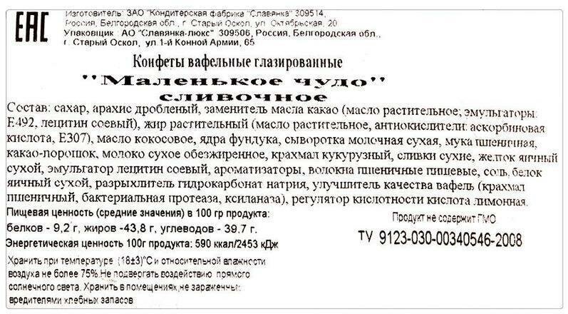 | Состав | сахар; арахис дробленый; заменитель масла какао (масло растительное, эмульгаторы (Е492, лецитин соевый)); жир растительный (масло растительное, антиокислители (аскорбиновая кислота, Е307)); мука пшеничная; масло кокосовое; сыворотка молочная сухая; арахис тертый; ядра фундука; какао-порошок; крахмал кукурузный; молоко сухое обезжиренное; ядра фундука тертые; спирт этиловый ректификованный; желток яичный сухой; эмульгаторы (лецитин соевый, Е476); ароматизатор; ароматизатор натуральный "Сливки с экстрактом сливок" (мальтодекстрин, сливки сухие); соль; белок яичный сухой; волокна пшеничные пищевые; разрыхлитель гидрокарбонат натрия; регулятор кислотности кислота лимонная |