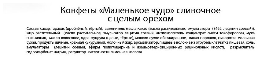 Состав: сахар, арахис дроблёный, тёртый, заменитель масла какао масло растительное, эмульгаторы Е492, лецитин соевый, жир растительный масло растительное, эмульгатор лецитин соевый, антиокислитель концентрат смеси токоферолов, мука пшеничная, масло кокосовое, ядра фундука целые, тёртые, молоко сухое обезжиренное, какао-порошок, сыворотка молочная сухая, продукты яичные, крахмал кукурузный, сливки сухие, ароматизатор, пищевые волокна из отрубей: клетчатка пищевая, спирт этиловый ректификованный, соль, эмульгаторы лецитин соевый, эфиры полиглицерина и взаимоэтерифицированных рициноловых кислот, разрыхлитель гидрокарбонат натрия, регулятор кислотности лимонная кислота.