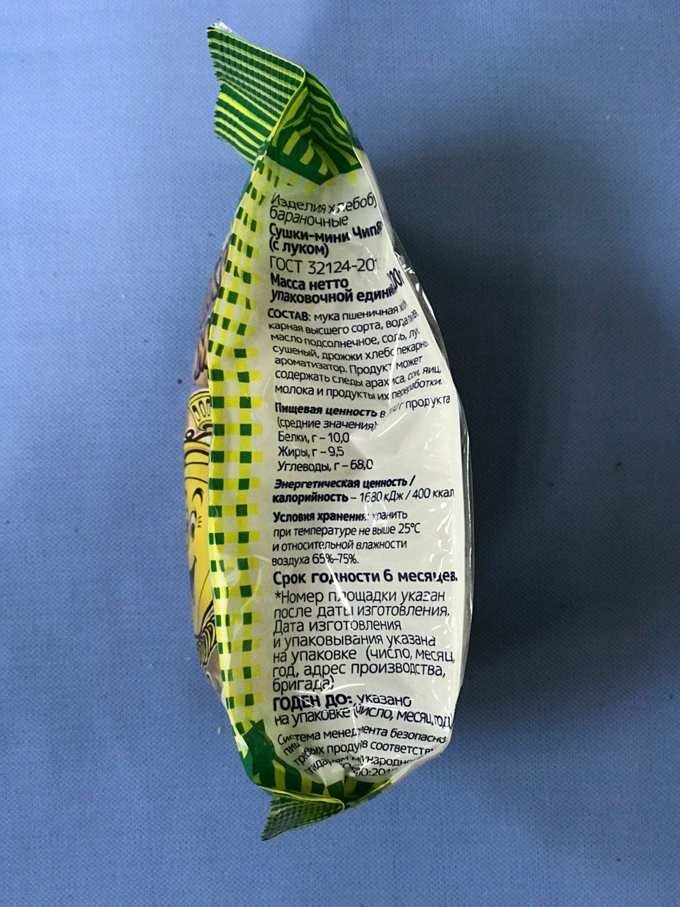 Состав: Мука пшеничная хлебопекарная высшего сорта, вода питьевая, масло подсолнечное, соль, лук сушеный, дрожжи хлебопекарные, ароматизатор. Продукт может содержать следы арахиса, кунжута, яичных и молочных продуктов
