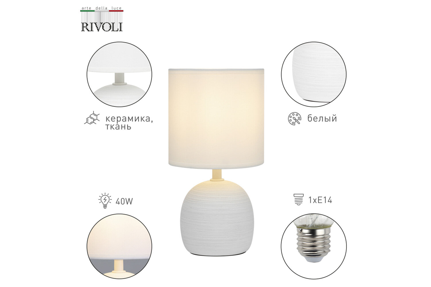 Настольная лампа Rivoli Sheron - красивое и практичное решение для вашего дома. Создаст в помещении уют и комфортную атмосферу для отдыха. Данная модель имеет классический белый абажур из качественной ткани. Светлые оттенки лампы выглядят лаконично и интеллигентно - светильник не потеряет своей актуальности спустя годы.