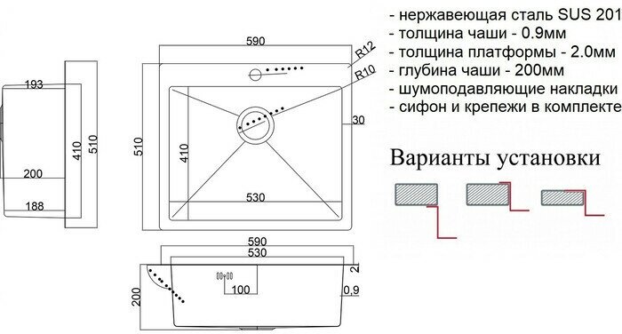 - Толщина материала мойки: 0.9 мм (кант 2 мм).