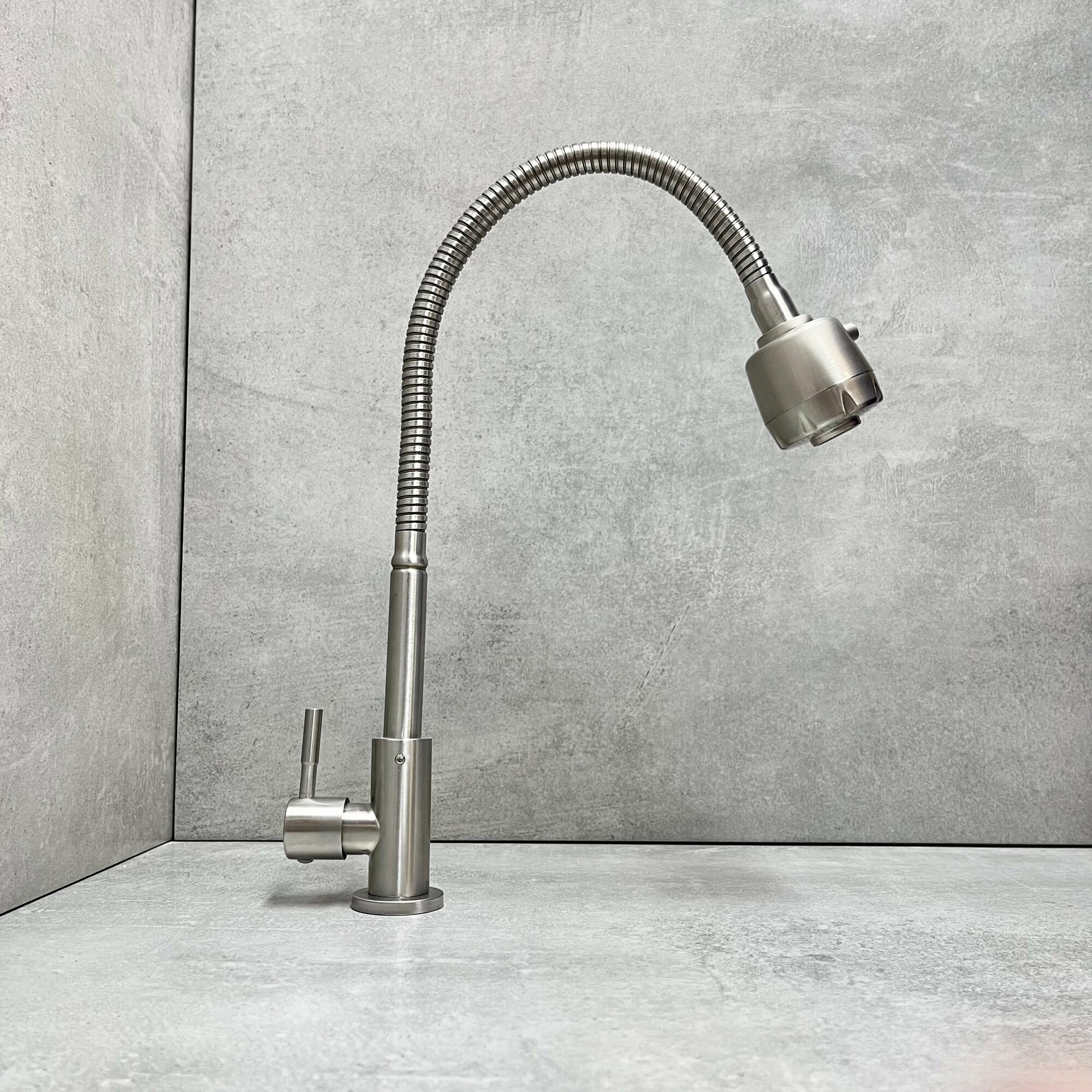 Смеситель с режимом душ для кухни. Рычажный смеситель предназначен для горизонтального крепления. Это универсальная модель, в современном стиле. Рычажный смеситель для кухни с гибким изливом изготовлен из нержавеющей стали. Смеситель оборудован керамическим картриджем, который обеспечивает точную настройку напора воды. Стандарт подводки: 1/2. Тип подводки: гибкая. Гибкий излив оснащен аэратором. Аэратор существенно понижает уровень шума. Комплектация: смеситель, подводка