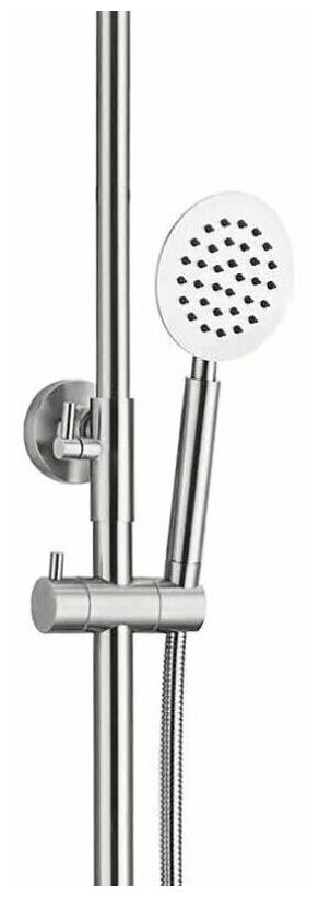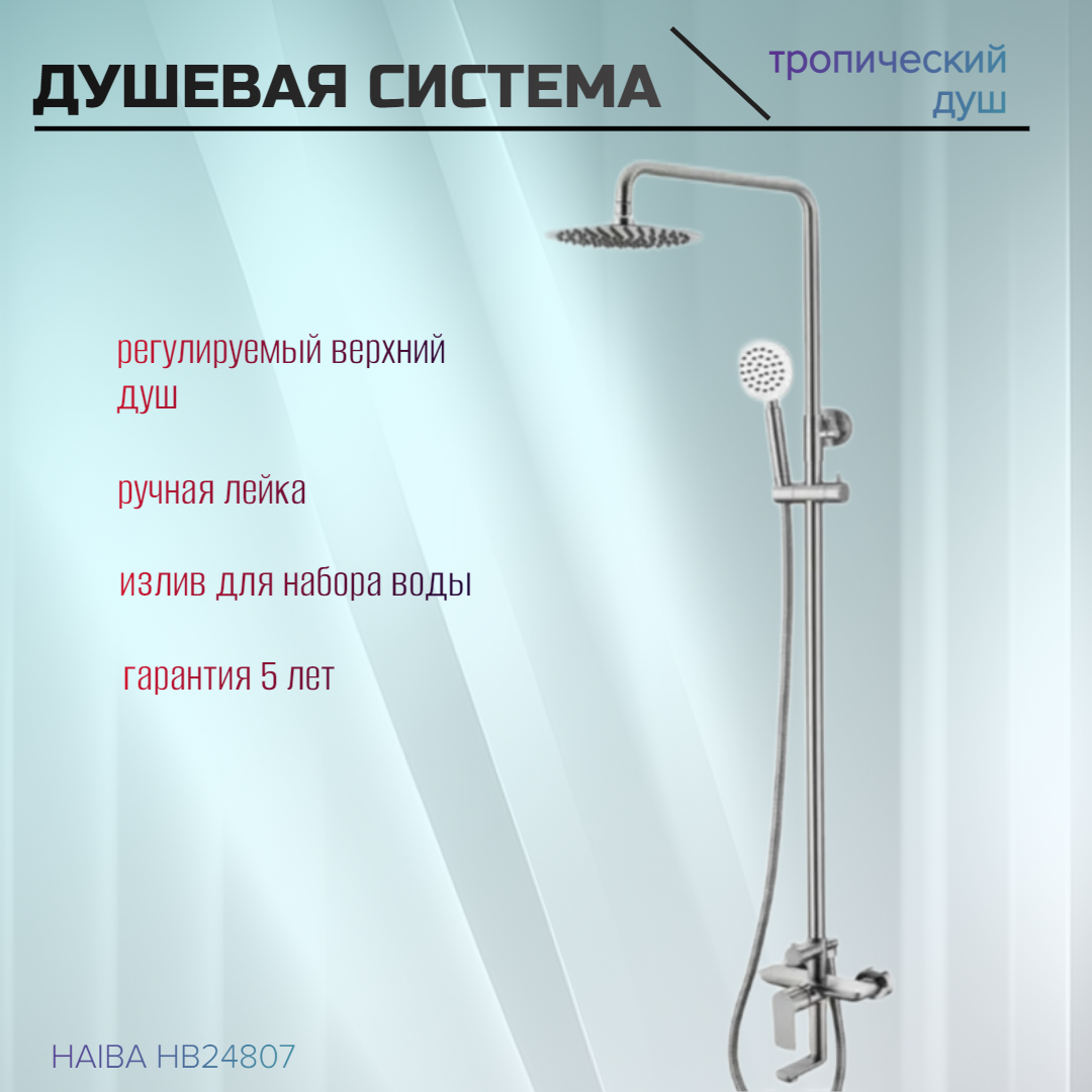 Душевая стойка Haiba HB24807 сталь. Верхний душ, душевая штанга, держатель душевой лейки, ручной душ, смеситель, шланг. Душевая система Haiba. Изготовлена из высококачественной нержавеющей стали. Прекрасный тропический душ. Излив для наполнения ванны. Душевая штанга регулируется по высоте от 88,2 см до 153,2 см.