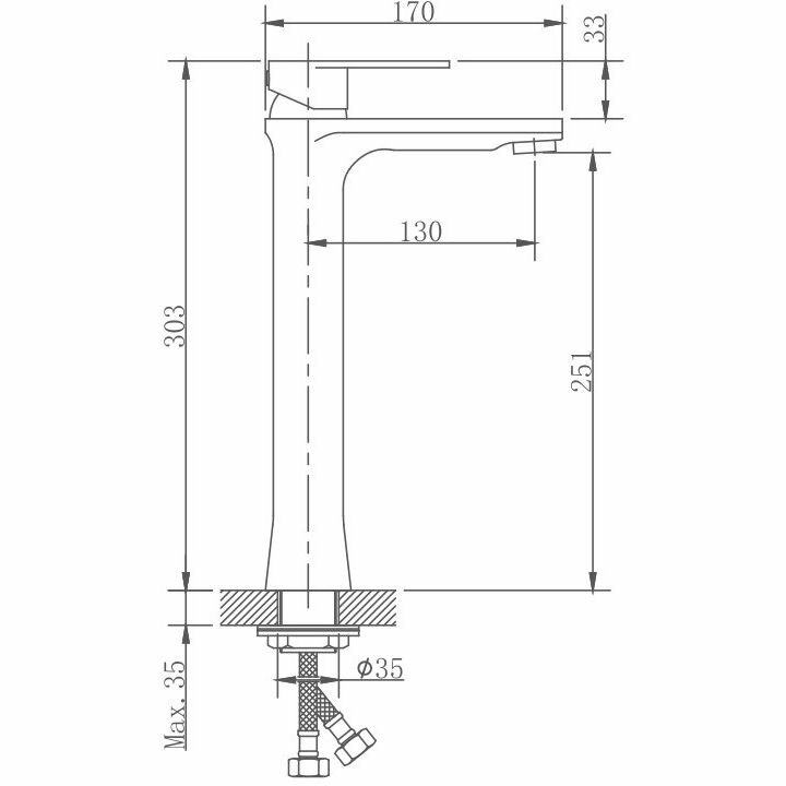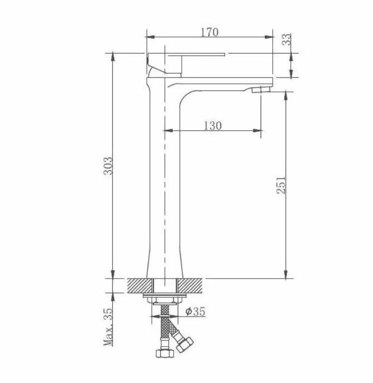 Высокий смеситель для раковины Haiba. Используется для установки на столешницу. Идеально подхлдит для раковин-чаш. Керамический картридж 35 мм. Изготовлен из нержавеющей стали. Максимальная глубина монтажа 35 мм. Диаметр монтажного отверстия 35 мм.